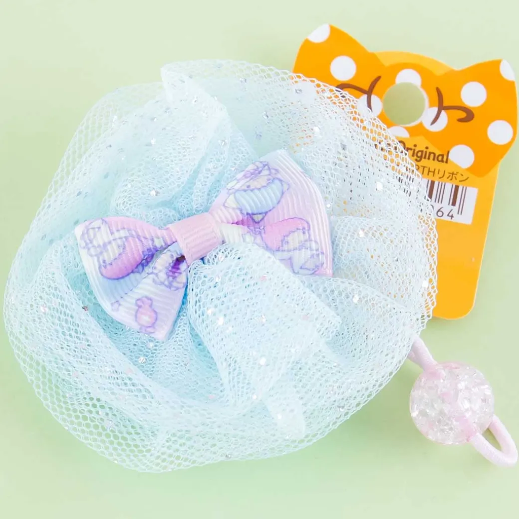 - A super kawaii hair tie decorated with a plastic jewel bead and glittery lace ball with a ribbon attached to it