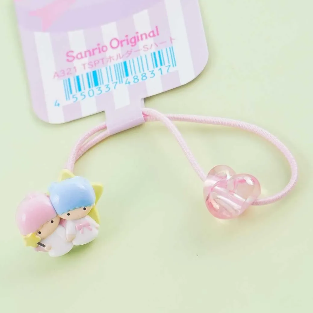 - An elastic hair tie with a holographic heart decor and a charm featuring the Little Twin Stars