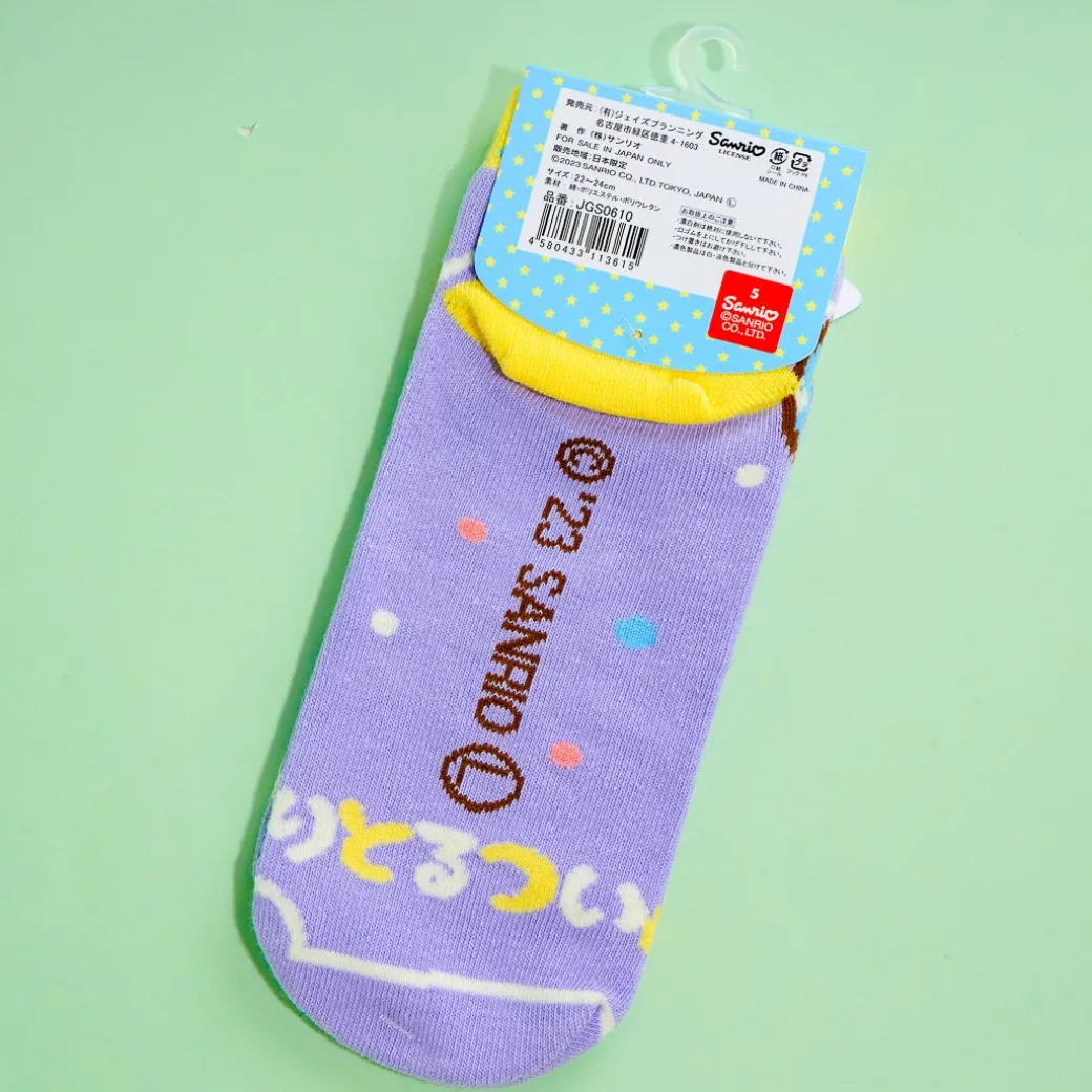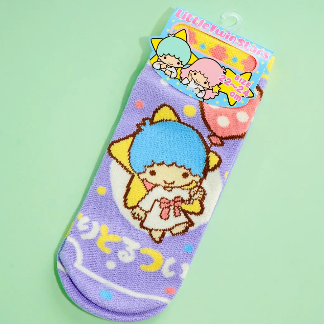 Keep your feet warm during the winter by donning this pair of purple jacquard socks! These are decorated with prints of Kiki from the Little Twin Stars playing with a polka-dotted balloon.