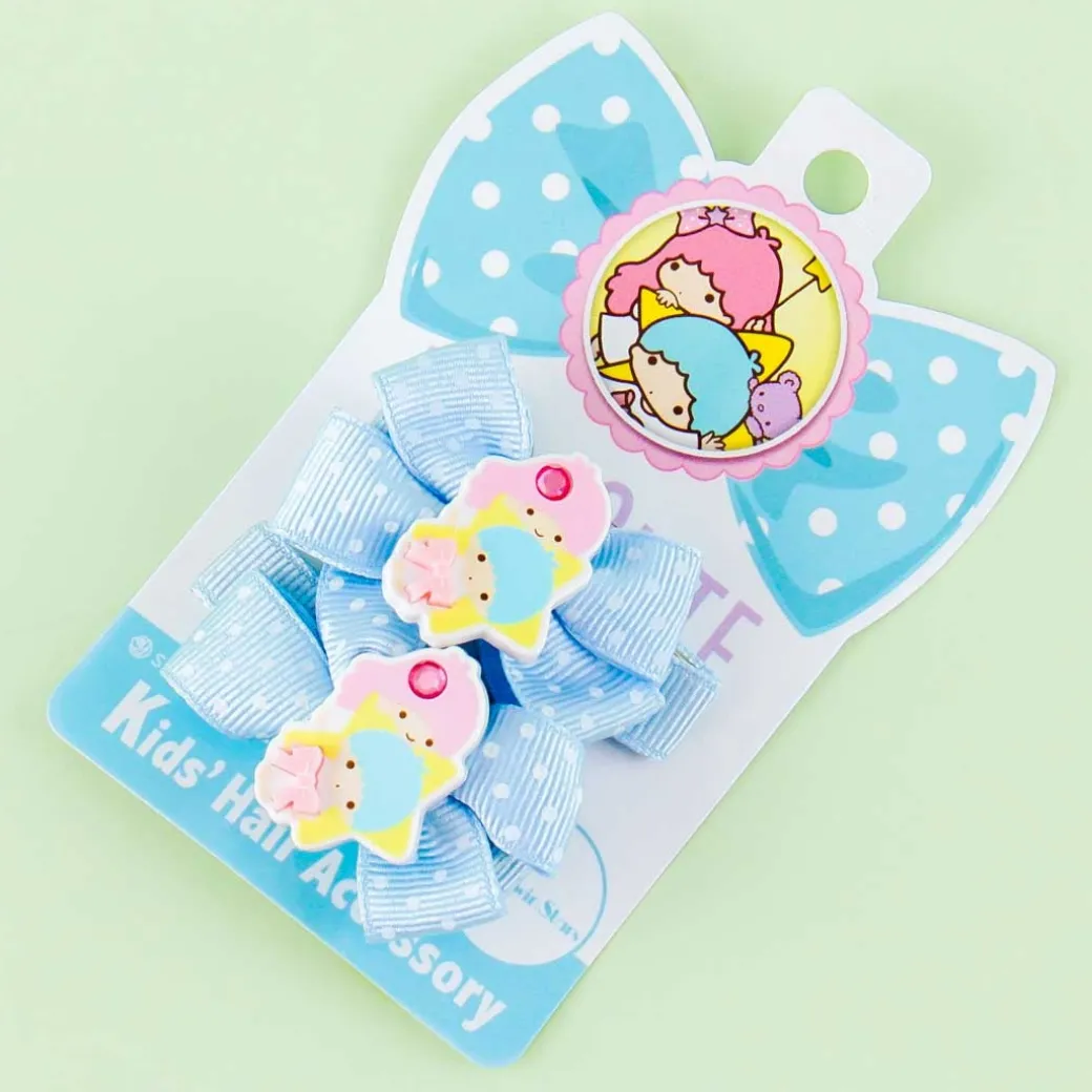 - A kawaii pair of hair clips featuring the Little Twin Stars, polka dot ribbons, and gemstones