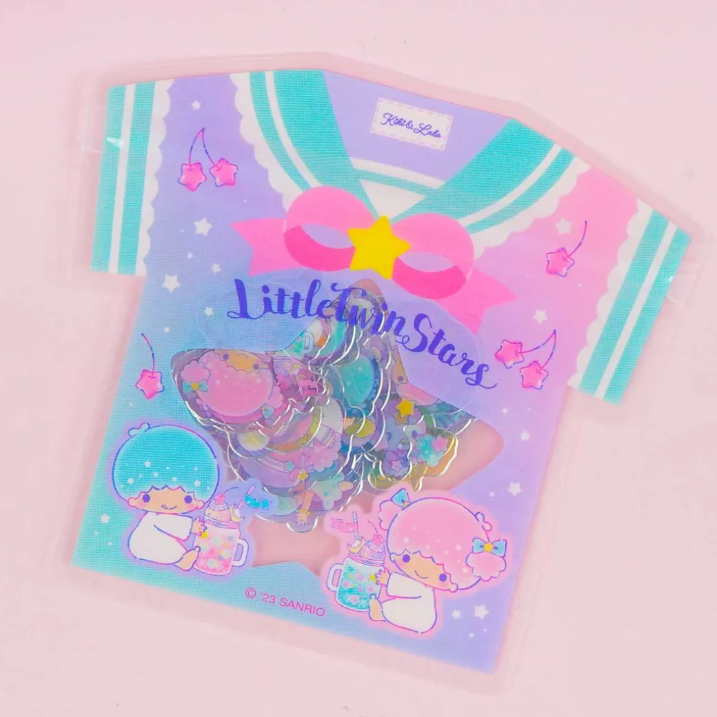 Decorate your notebook covers with these kawaii die-cut sticker flakes! They feature cute illustrations of the Little Twin Stars playing in summer. The seals come in a t-shirt-shaped bag so you can easily keep them safe.