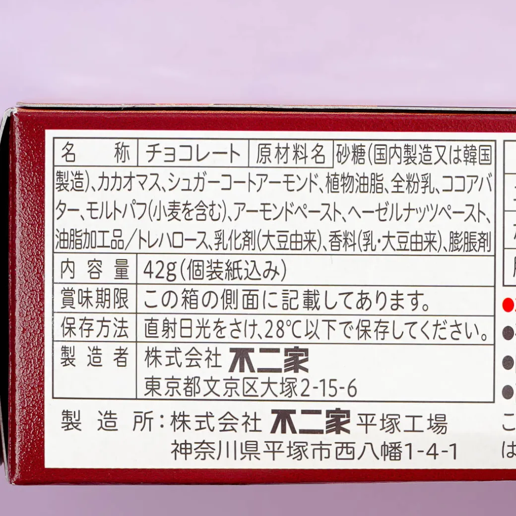 Indulge in this box of premium chocolate pieces! Each one has a sugar-coated roast almond in the center. It also has bits of praline whipped cream and malt puffs!