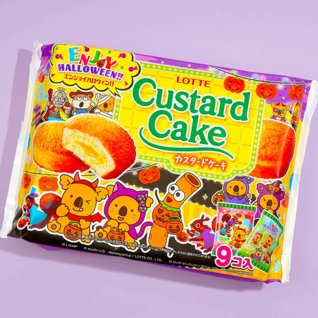 This pack of custard cakes is illustrated with Lotte characters all dressed up for Halloween! Share it with your family and friends. Each individually-wrapped piece showcases Halloween designs.