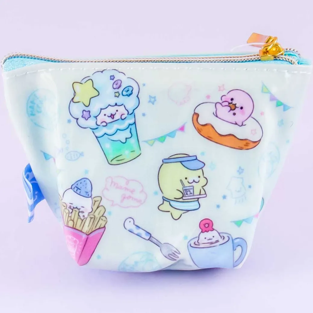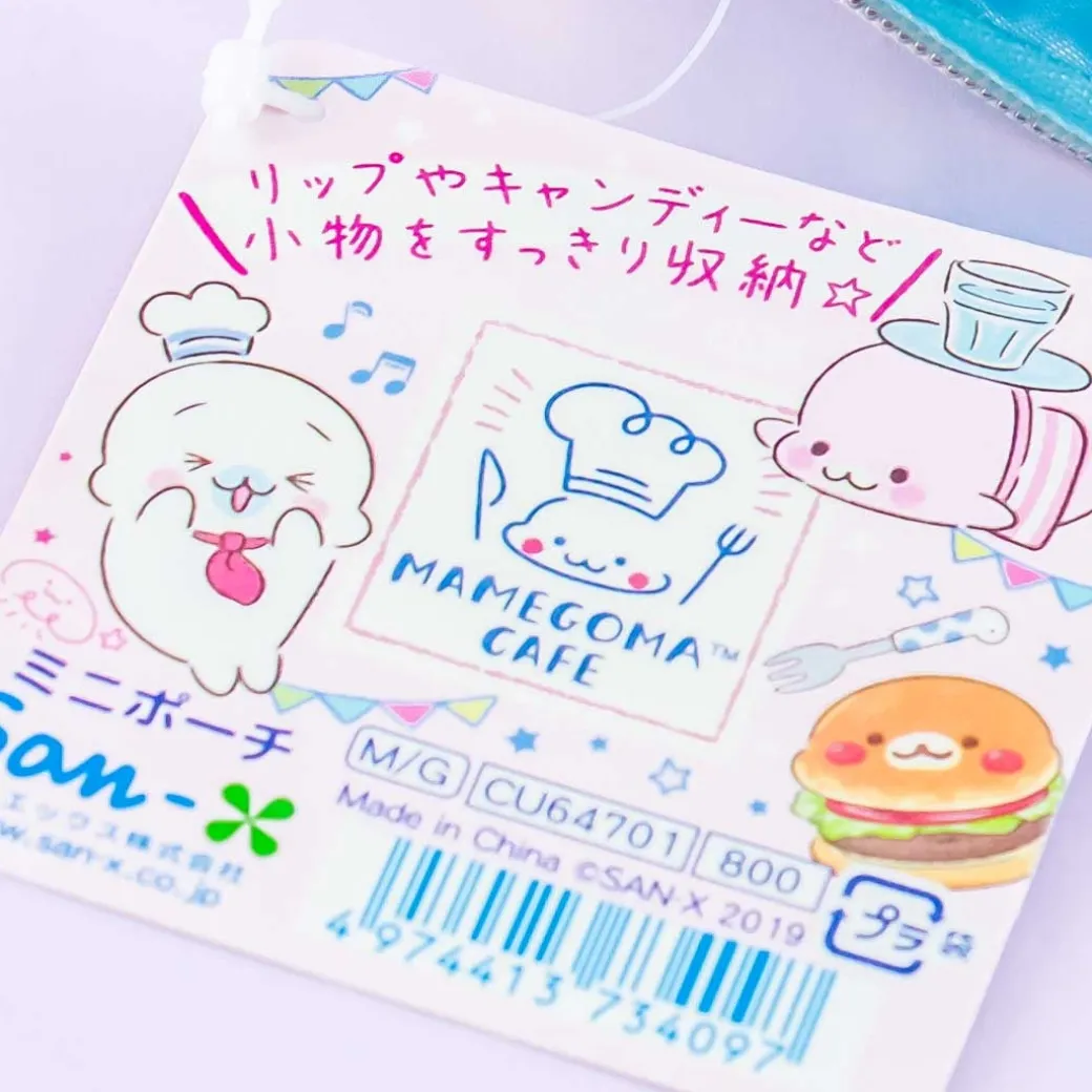 - A zippered coin purse featuring Mamegoma characters and café food