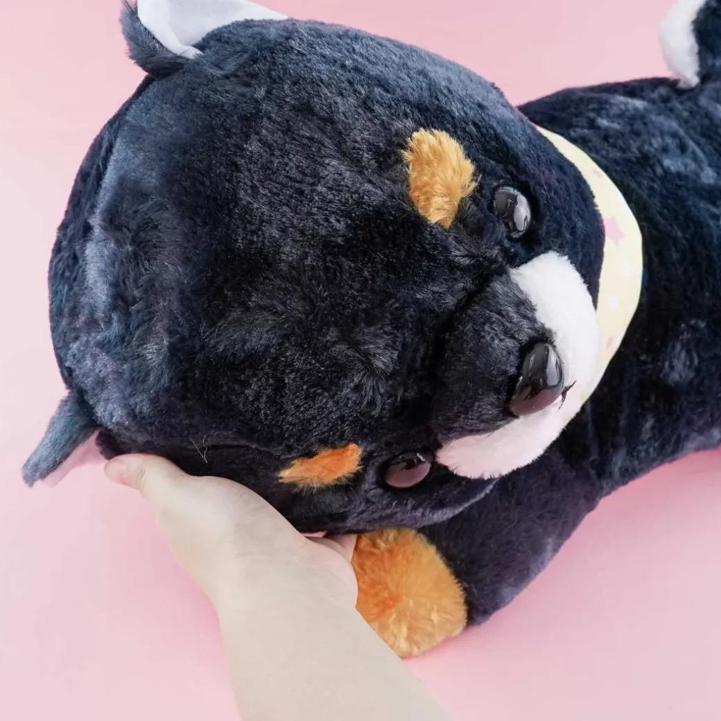 - A cute big Mamejiro plushie from the Mameshiba San Kyodai lying down ready to sleep
