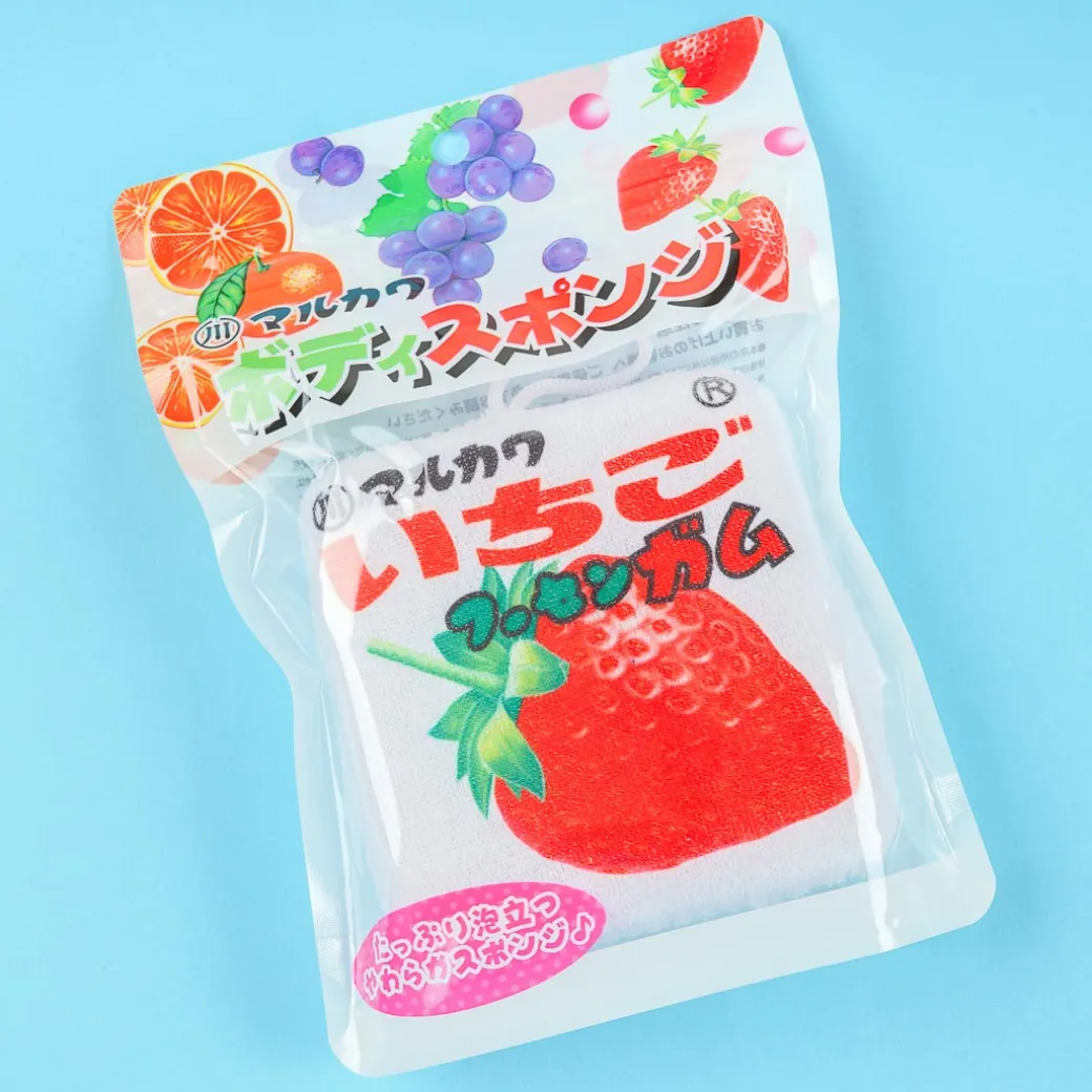 Use this kawaii body sponge next time you take a shower! It’s illustrated with strawberry Marukawa Bubble Gum packaging and comes with a hanging loop.