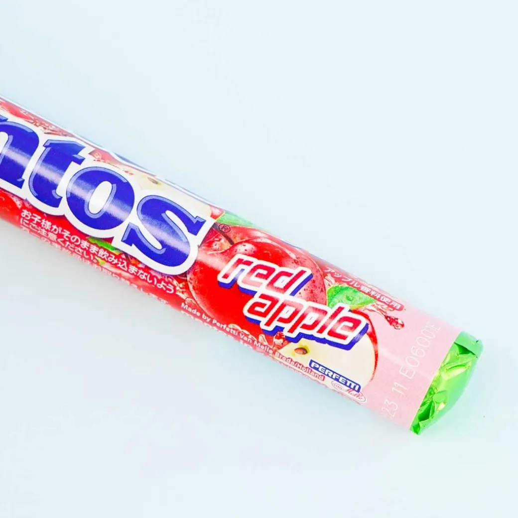 - A stick pack of red apple-flavored sugar shell candies with soft red apple candy filling