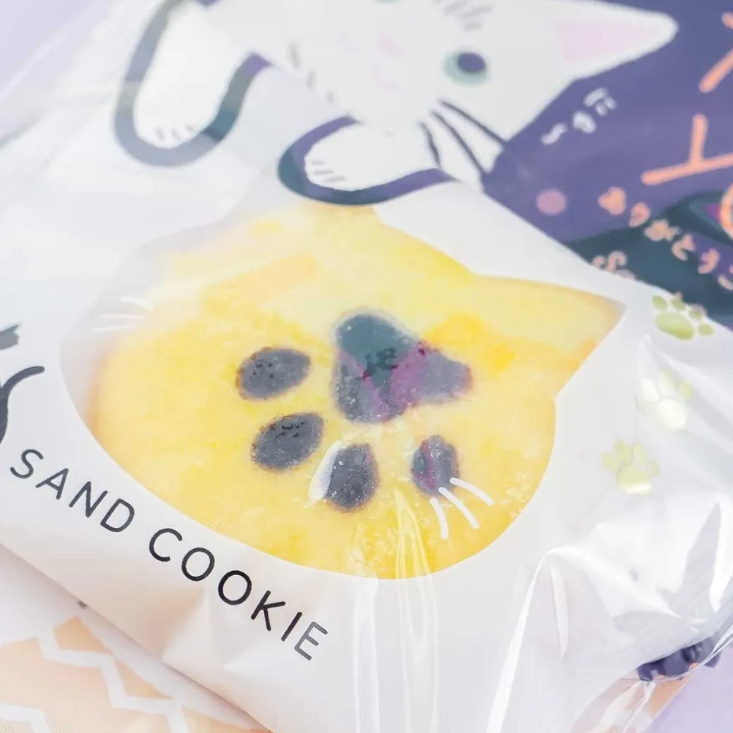 - A cream-centered cookie sandwich in packaging decorated with a cat saying thank you