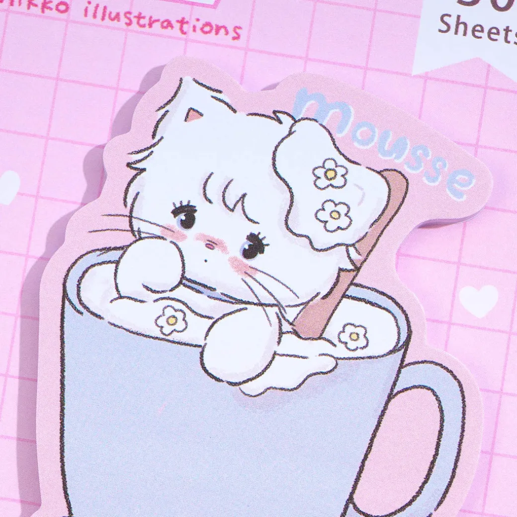 Write your short reminders on this sticky note pad that’s shaped like a teacup! It features a print of Mousse, a fluffy cat from Mikko Illustrations.