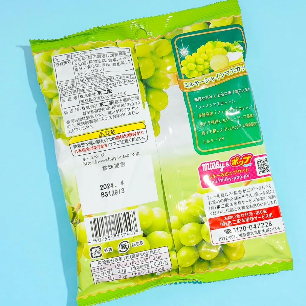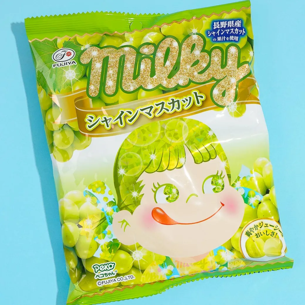 Have fun eating this limited edition Milky candy with the juicy taste of Shine Muscat grapes from the Nagano Prefecture in Japan. Its packaging features Peko-chan looking shiny and green like the fruit.
