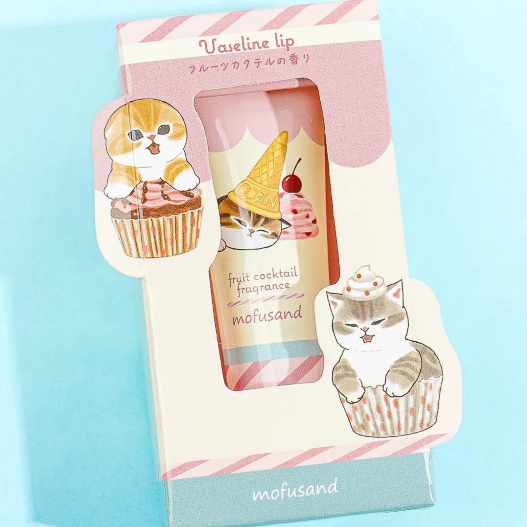 Add this tube of vaseline lip gloss to your beauty kit. It showcases a print of a happy Mofusand cat sleeping with an ice cream cone on its head! This lip gloss has a lovely fruit cocktail scent.