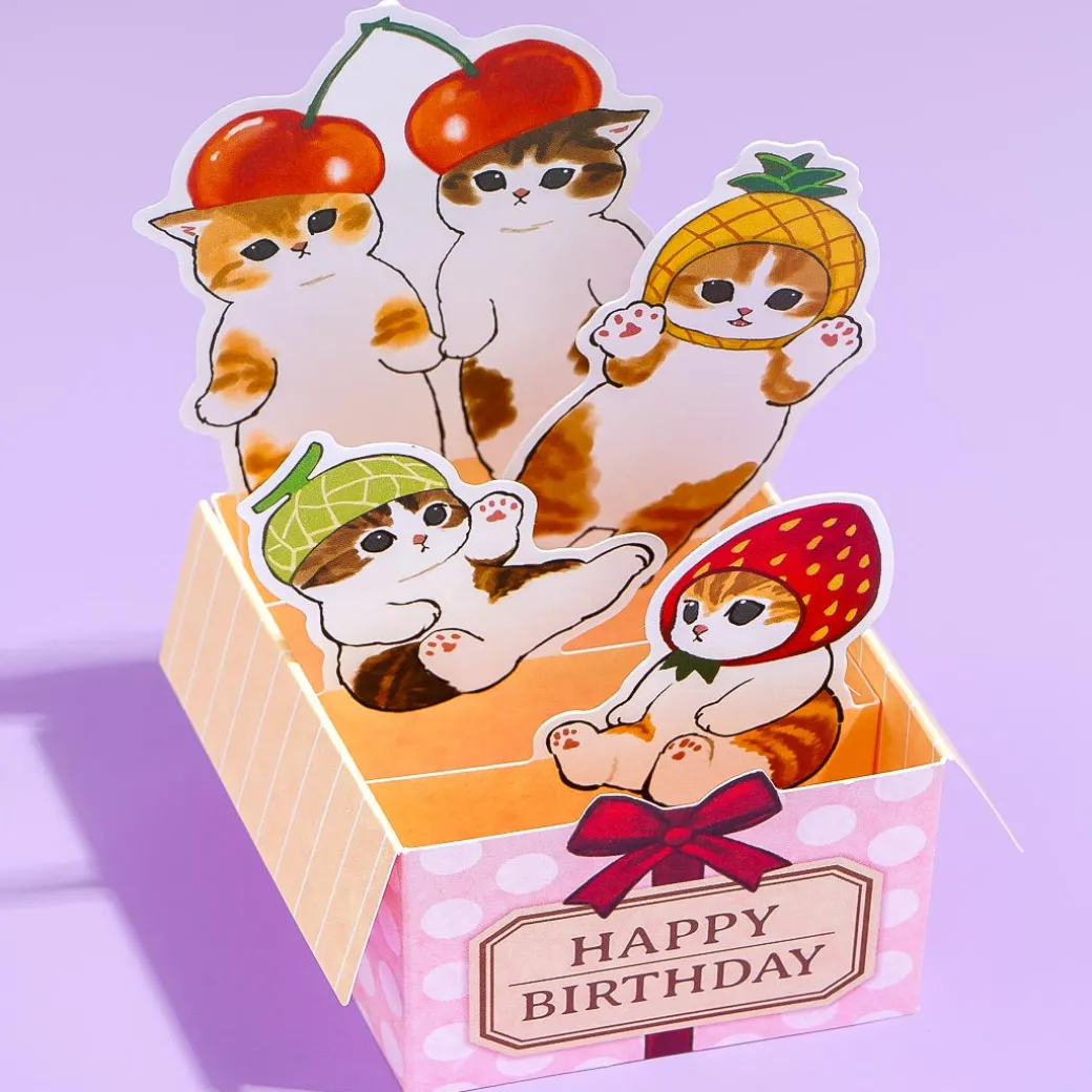 Send sweet birthday greetings to your friend with this super cute card featuring kawaii Mofusand characters with fruit headgear. It pops up into a box so the die-cut characters look like they’re inside a gift box.