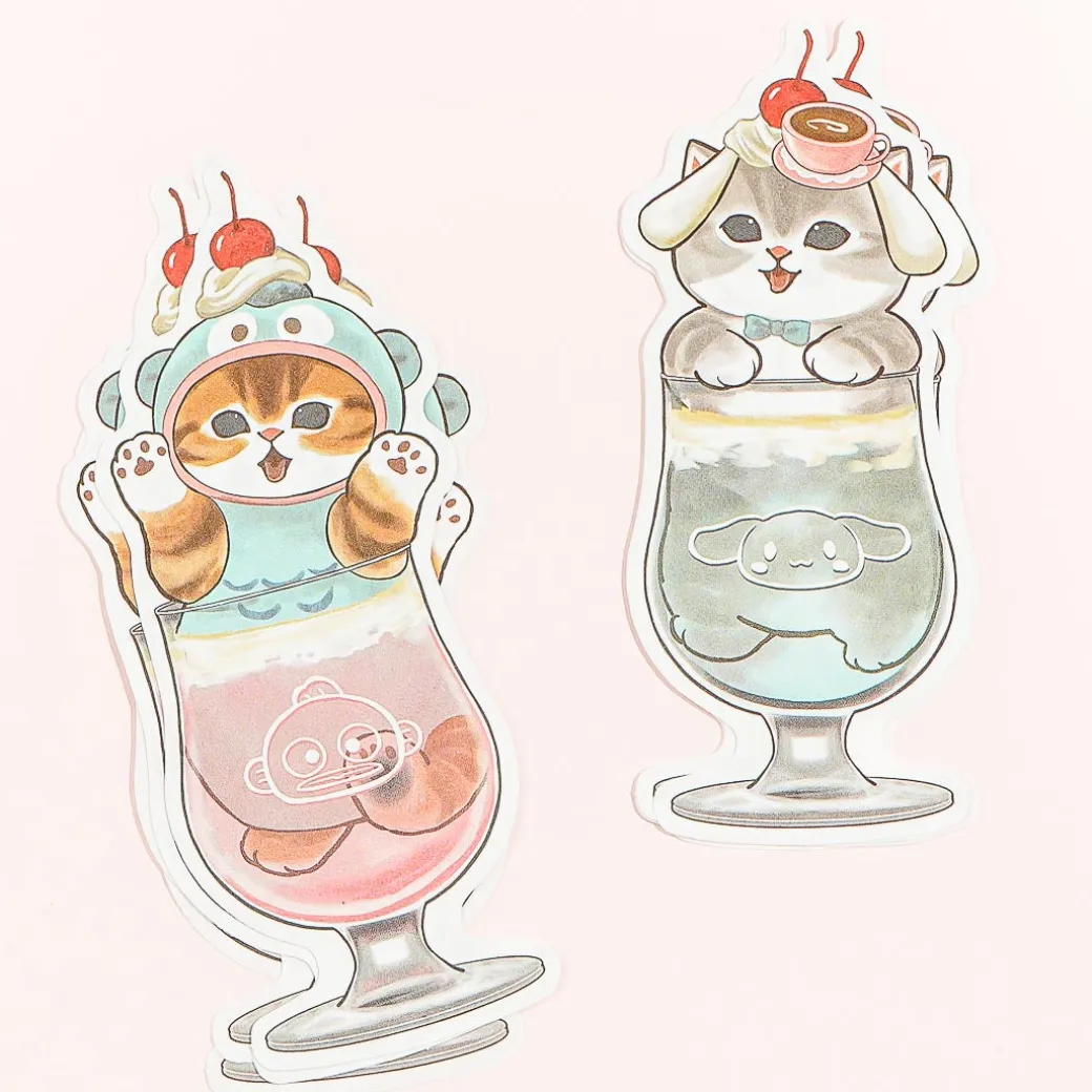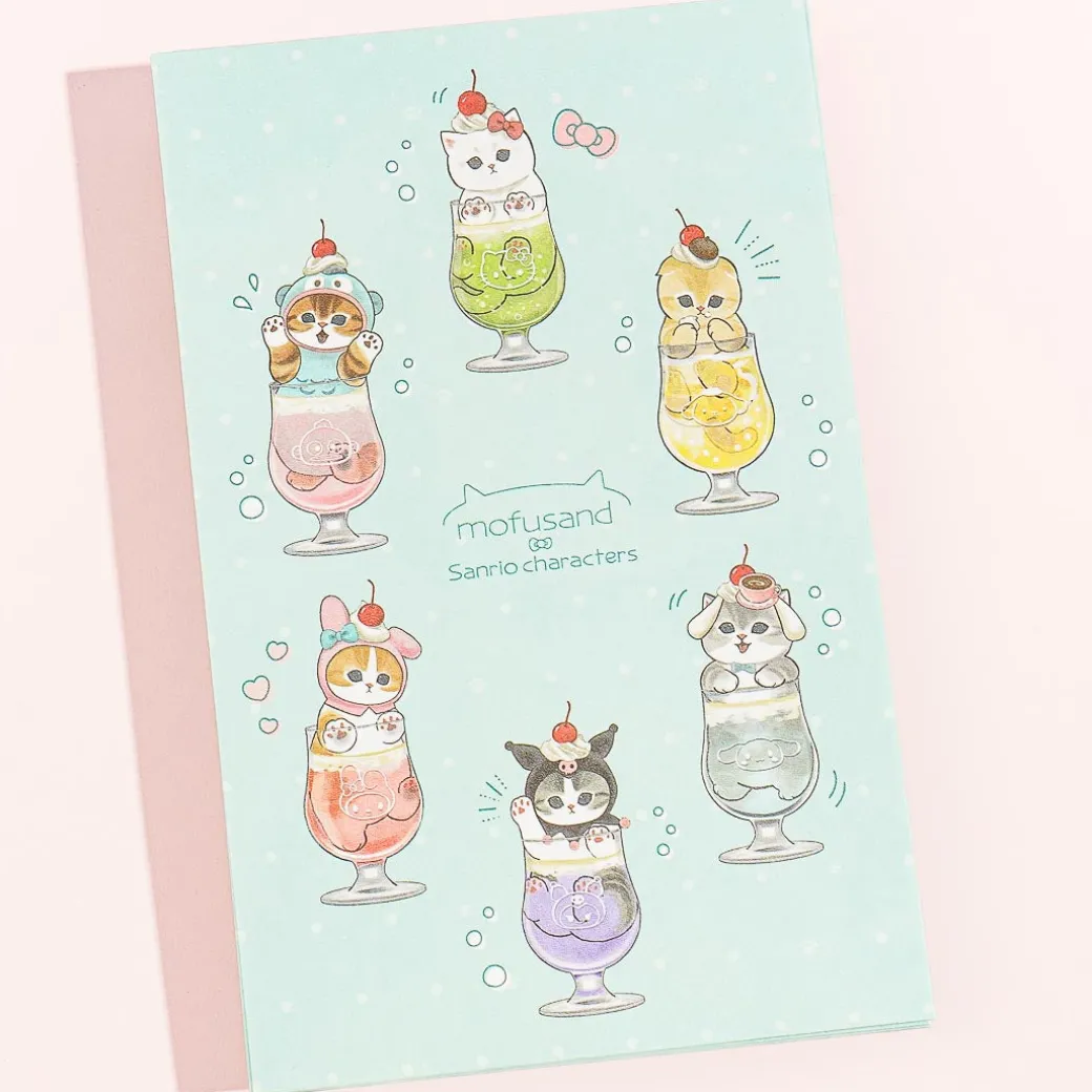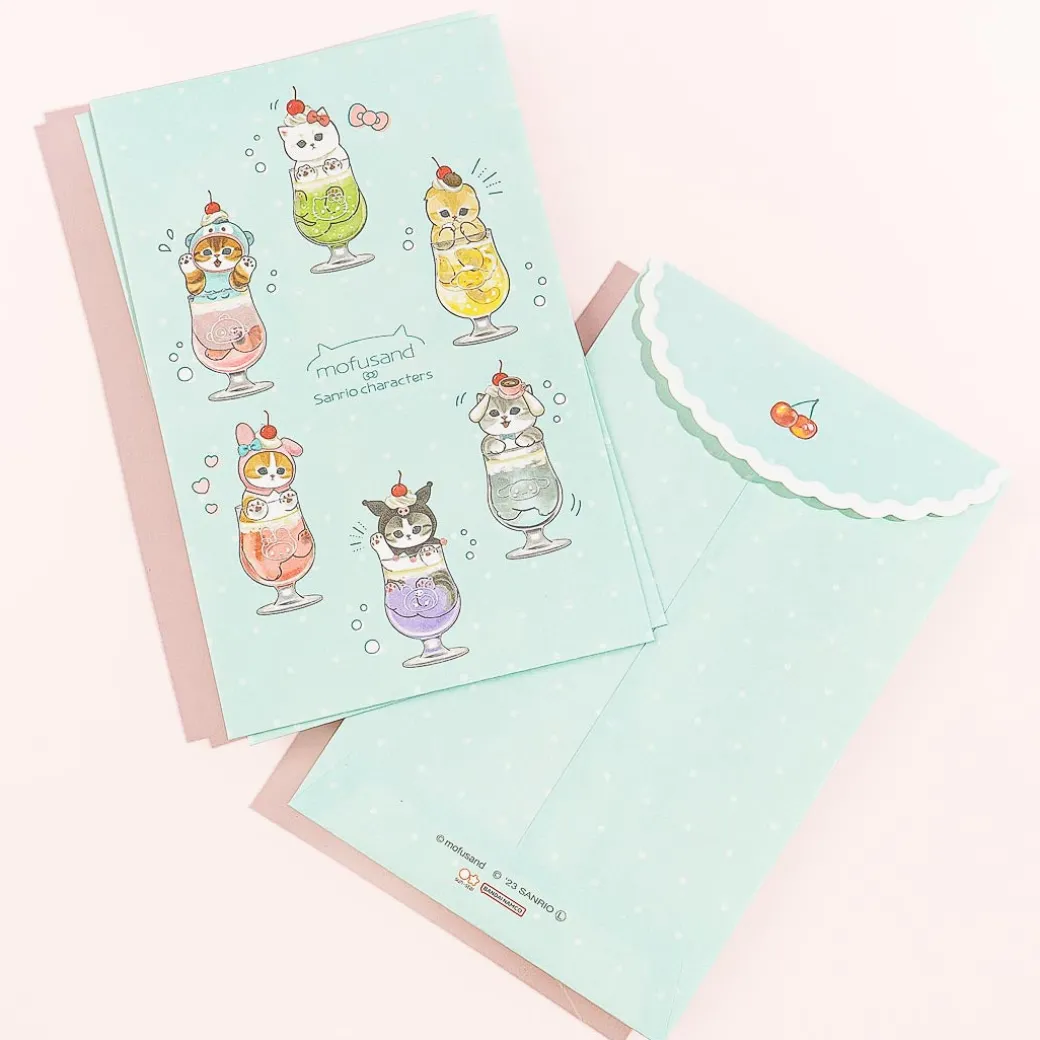 Enjoy exchanging letters with your besties using this super cute set! It includes sheets and envelopes decorated with kawaii prints of the Mofusand cat characters dressed as the cuties from Sanrio Characters — while inside giant cream soda glasses!
