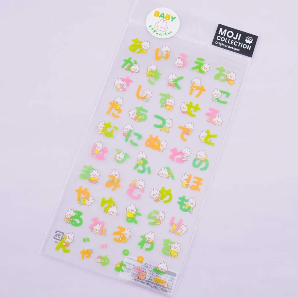 - A cute sheet of die-cut stickers featuring Baby Muu-chan the rabbit with Hiragana characters