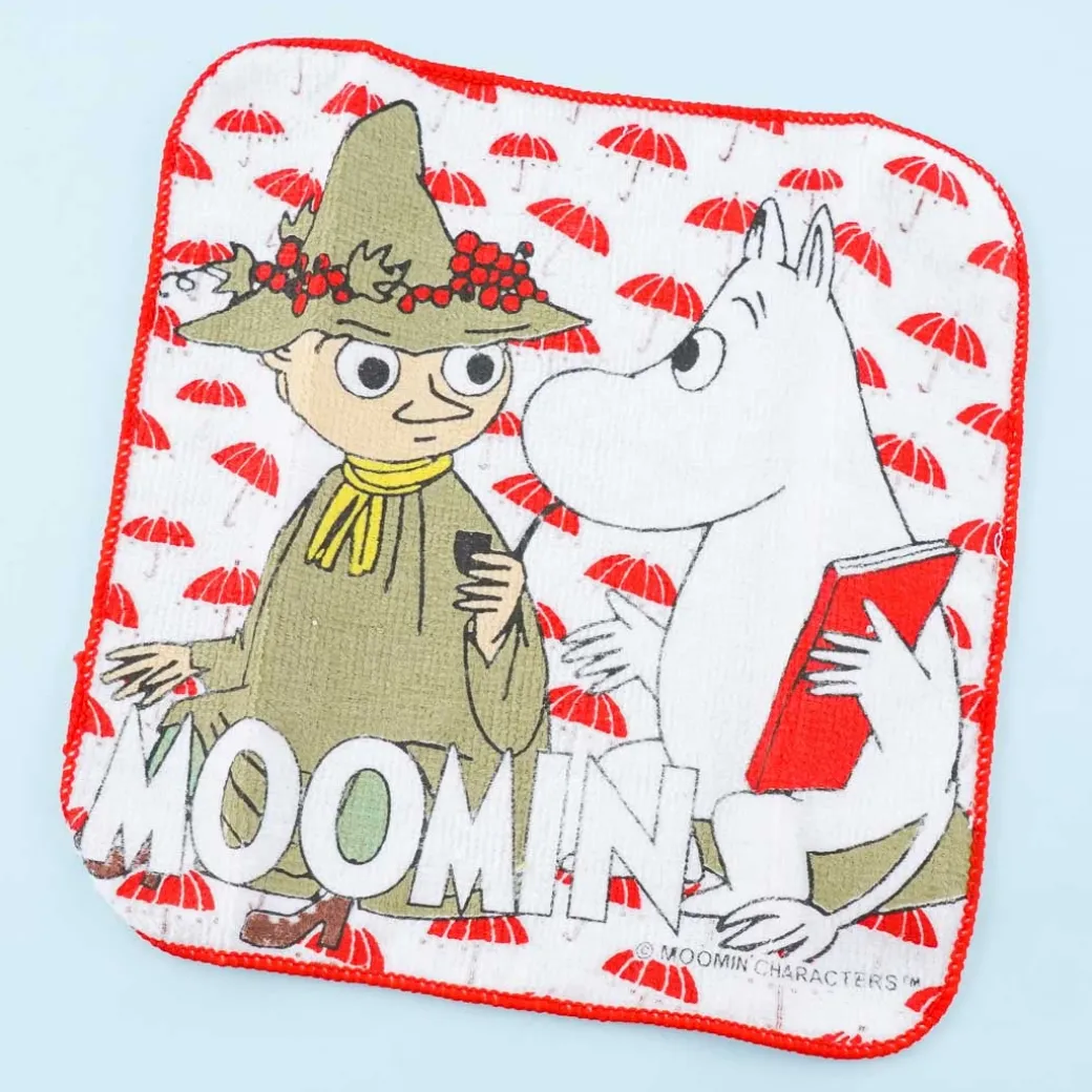 - A kawaii square-shaped towel featuring Moomin characters and red umbrellas