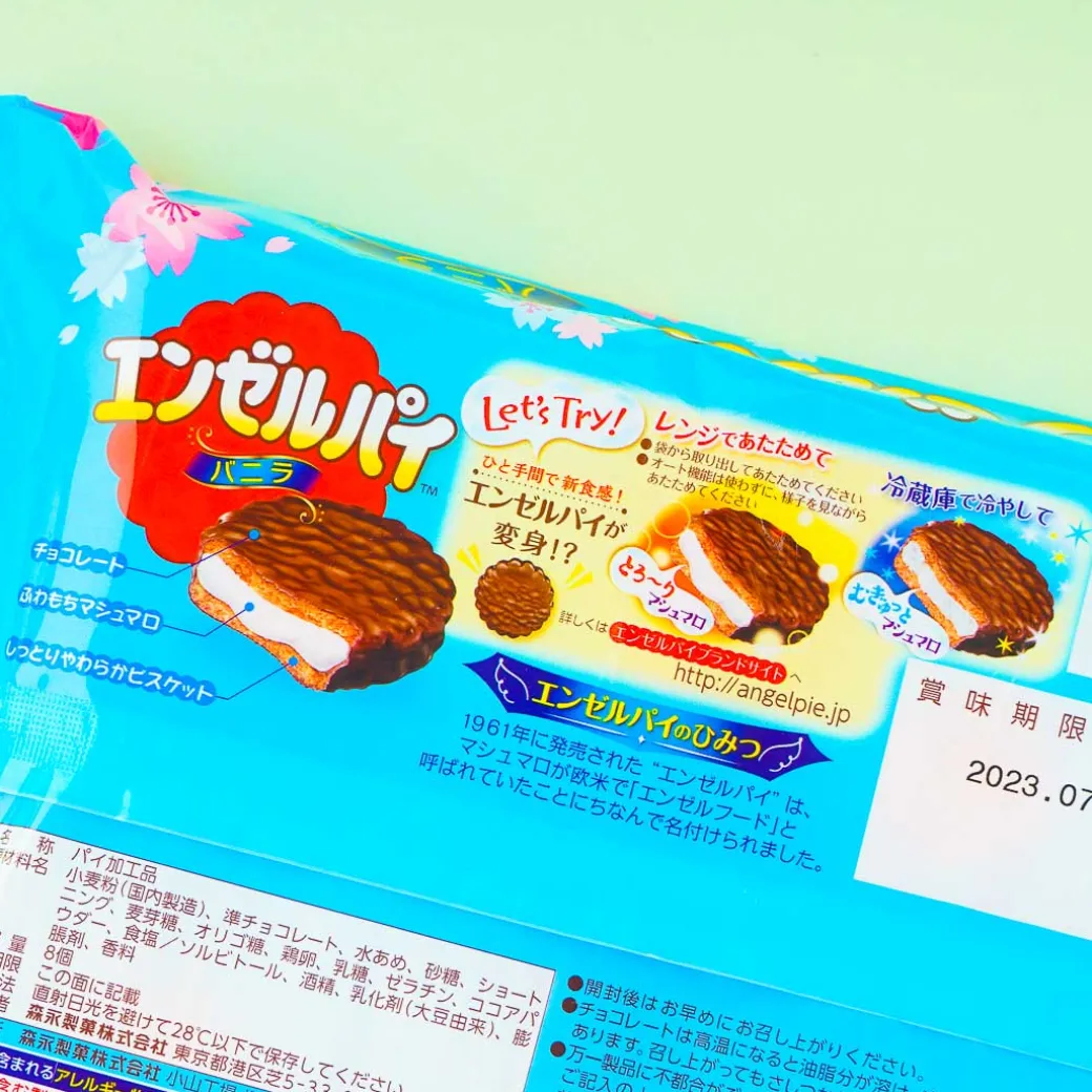 Enjoy snacking on these angel pies that are generously filled with fluffy vanilla marshmallow cream! These treats are also generously coated with rich chocolate. The packaging features Easter eggs and sakura blossoms.