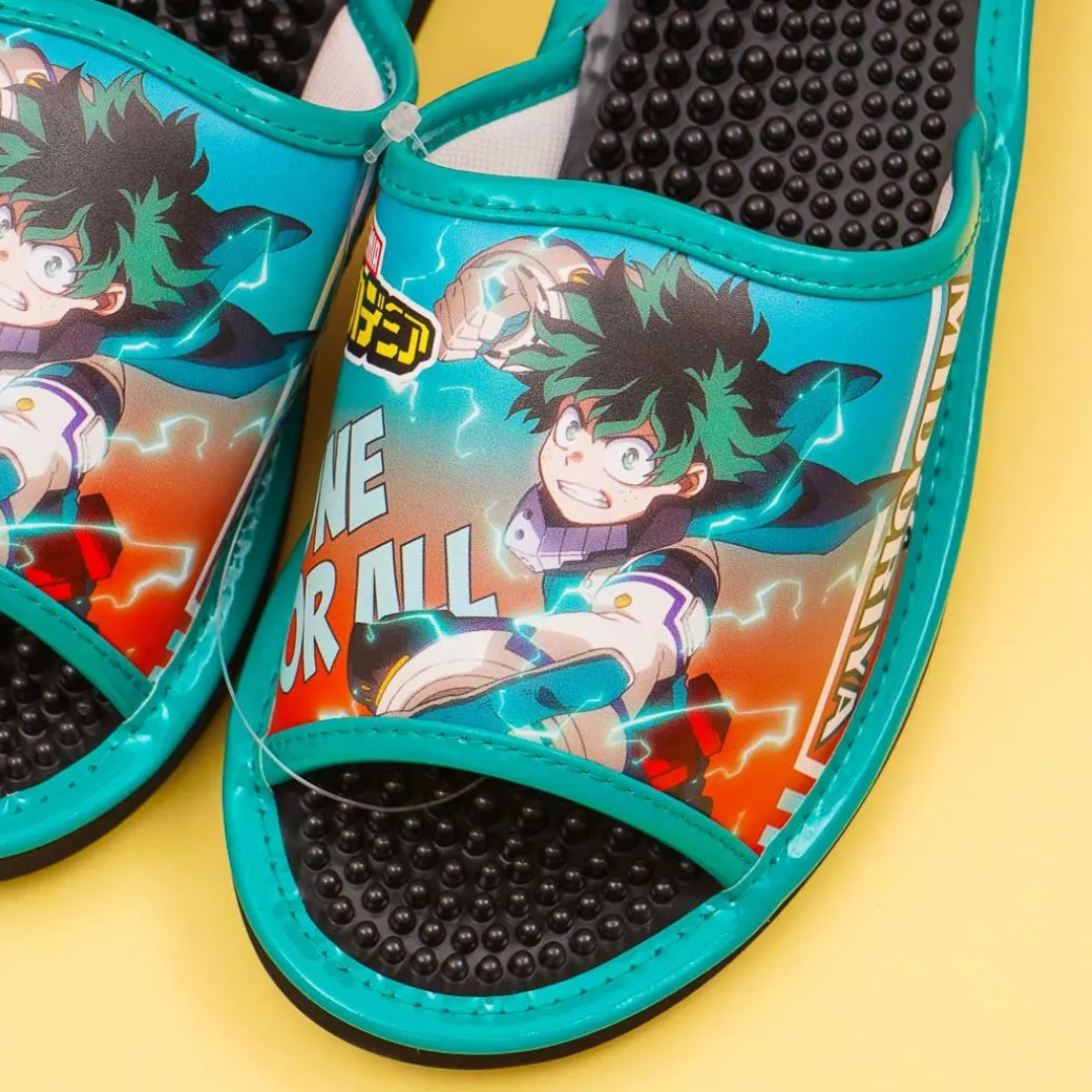 - A medium pair of green acupressure slippers featuring Izuku Midoriya of My Hero Academia
