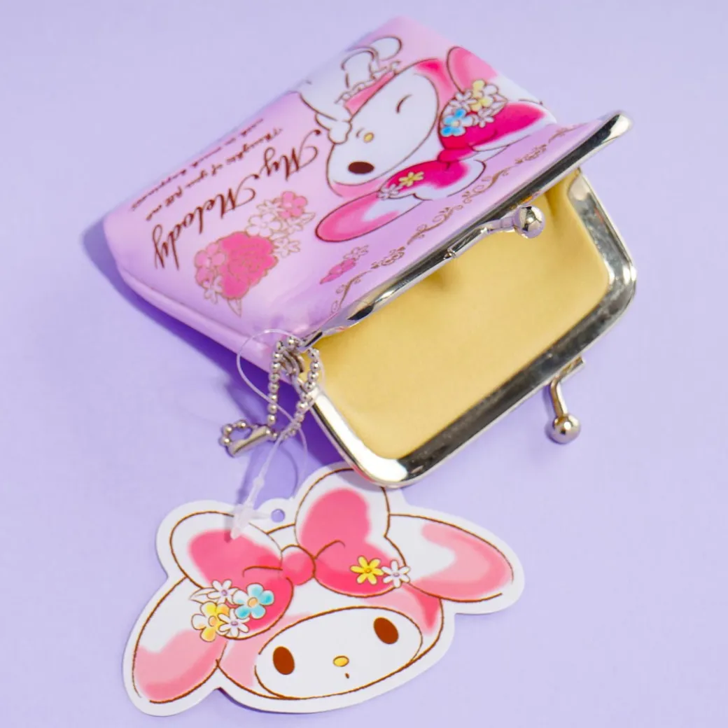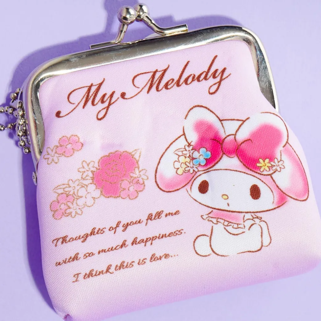 This super cute pink purse has a vintage-inspired print of My Melody doing an air kiss! Keep your coins and cash safe inside as it also comes with a convenient clasp closure.