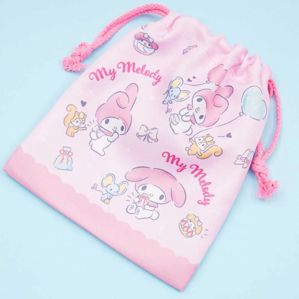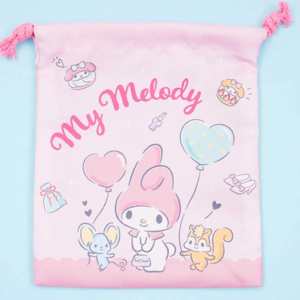 - A super kawaii drawstring pouch showcasing prints of My Melody, her friends, and balloons