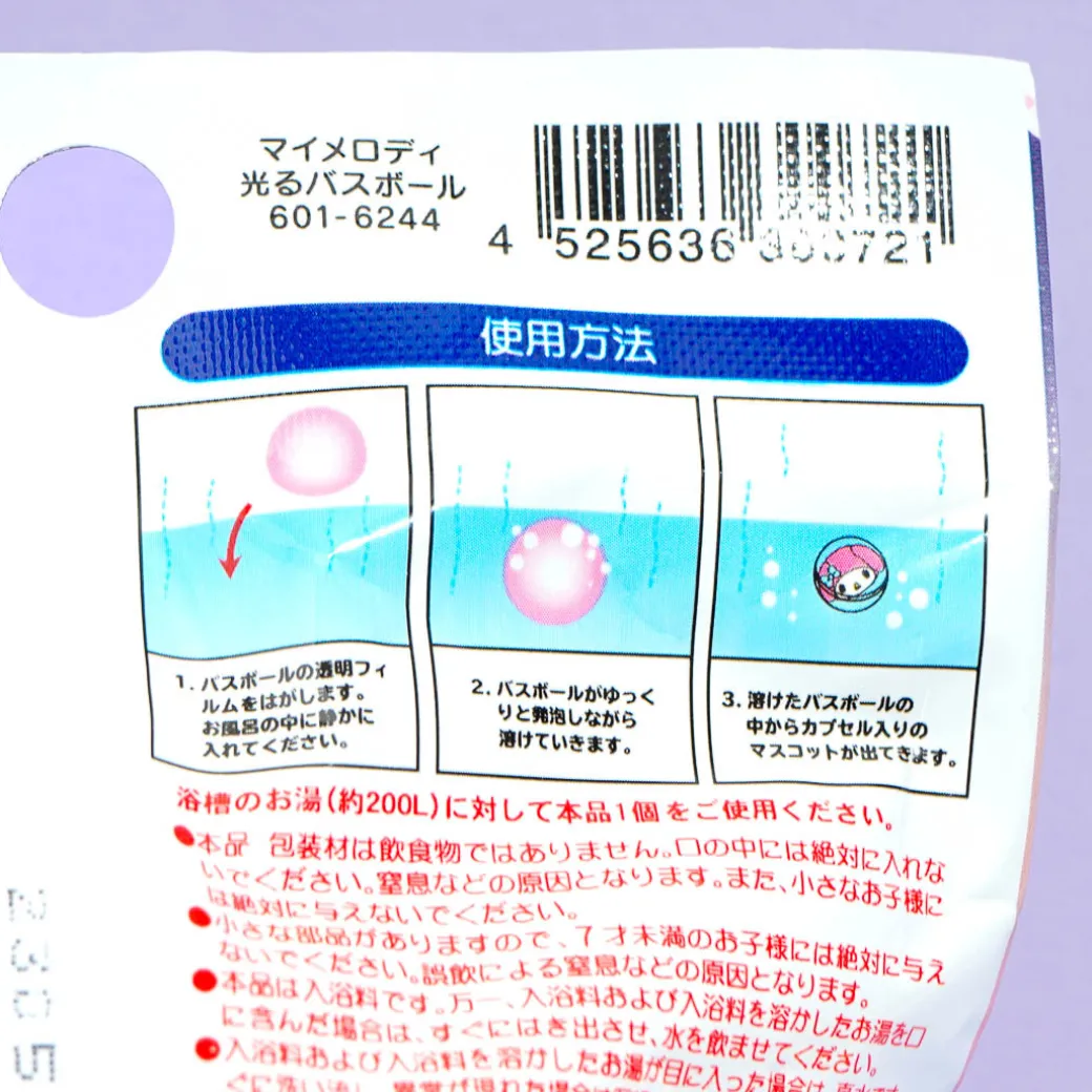 Have a fun bath time by using this peach-scented bath ball! Watch as the ball melts in the tub revealing a cute My Melody toy. When you pinch the toy, it will light up in 3 patterns — fast flashing, alternate flashing, slow flashing.