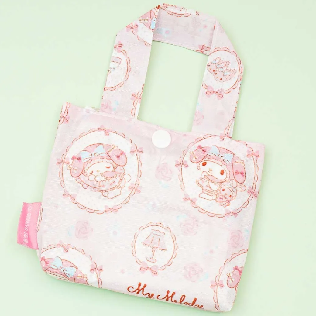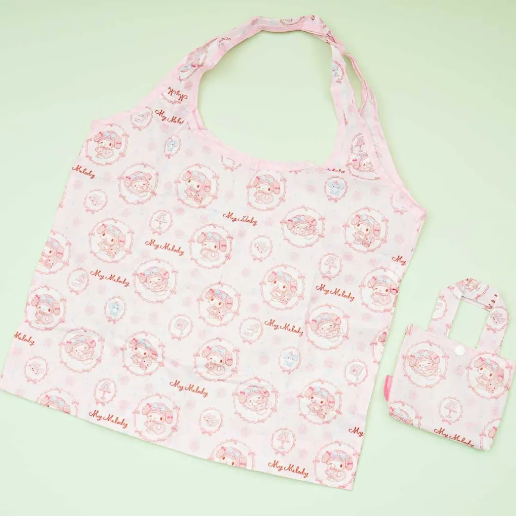 - A kawaii reusable tote decorated with prints of My Melody in cameo brooches