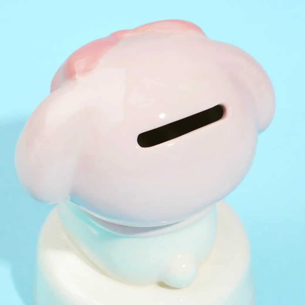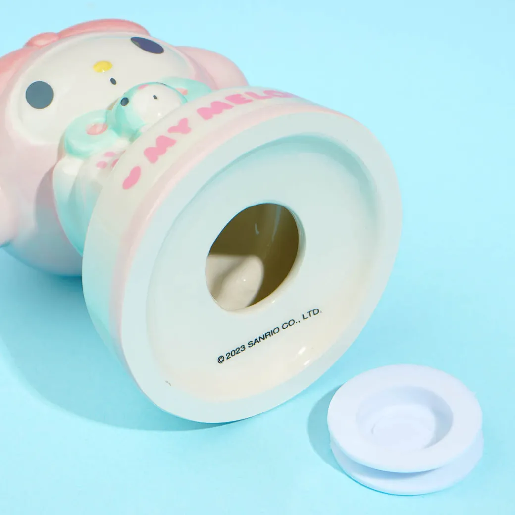 Save your loose change and extra money inside this super cute coin bank! It features a standing My Melody hugging Flat, her blue mouse friend. You can also use this to kawaii-fy your desk!