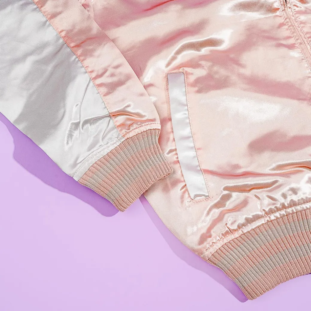 This super cute jacket is inspired by the iconic “sukajan” or the Japanese baseball varsity jacket that’s known for its large back design! Wear this shiny pink and white bomber jacket to keep you warm when it’s rainy! It has long sleeves, a small My Melody embroidery at the front, and a bigger version at the back!