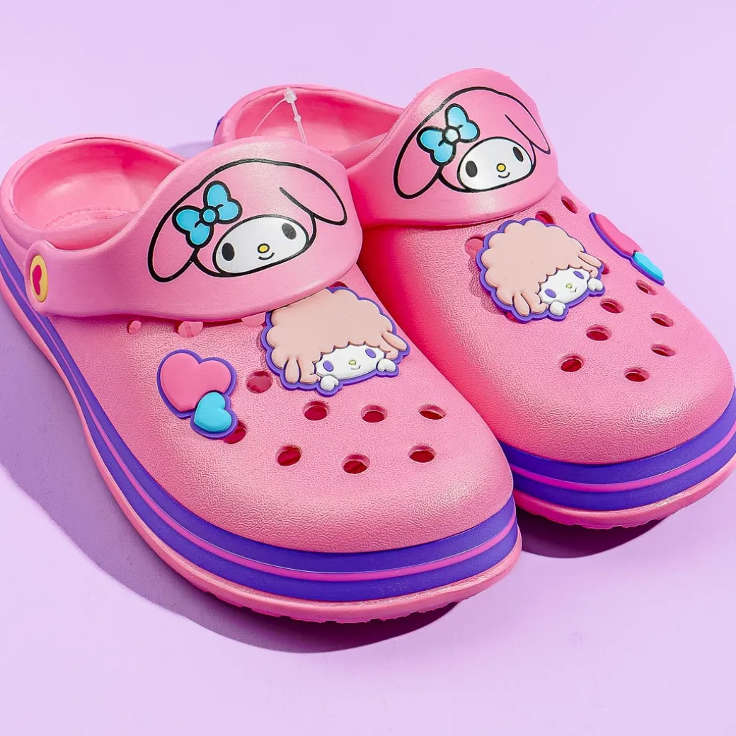 This super kawaii pair of large-sized sandals has illustrations of My Melody and cute rubber charms of hearts and My Sweet Piano! Wear this comfy pair while lounging around the house. The pink slippers are made from EVA — a special rubber-like resin material.
