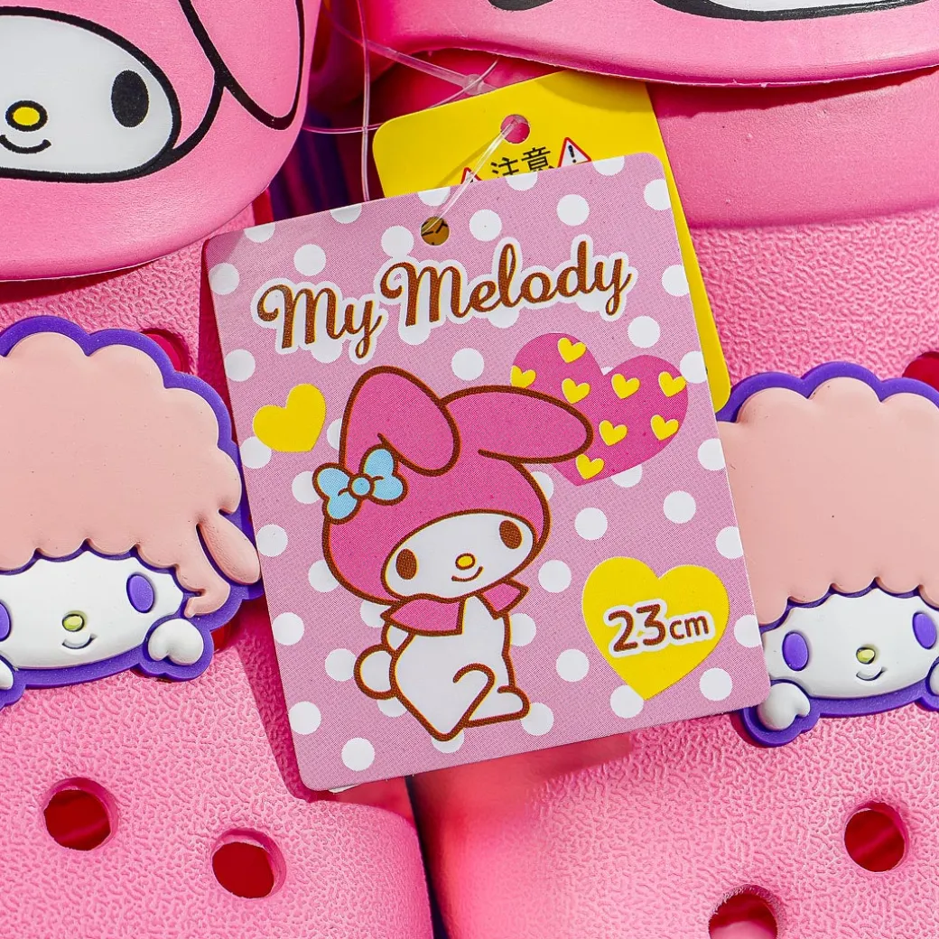 Wear this super cute pair while strolling along the shore! These medium pink slippers have kawaii illustrations of My Melody and rubber charms of My Sweet Piano and hearts! The comfy sandals are made from a rubber-like resin called EVA.