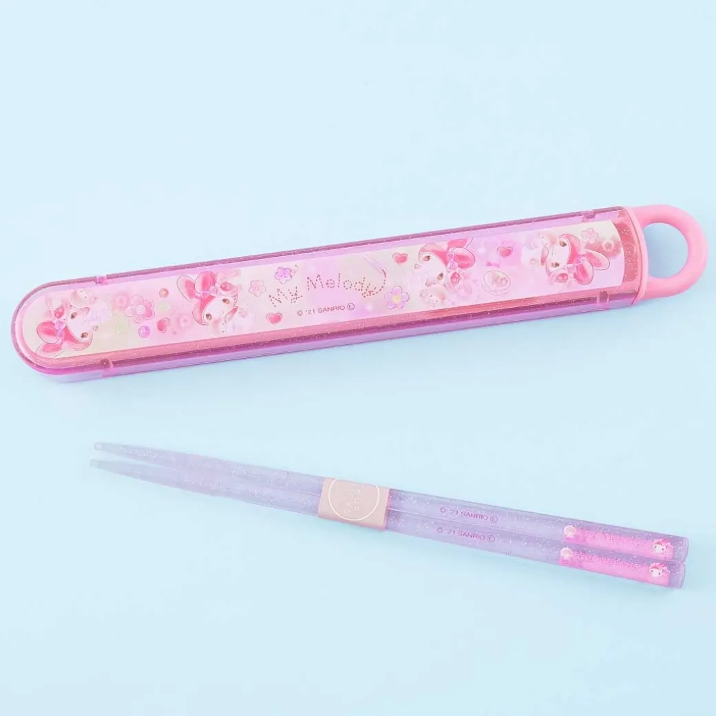 - A cute pair of chopsticks with a case featuring prints of My Melody and flowers