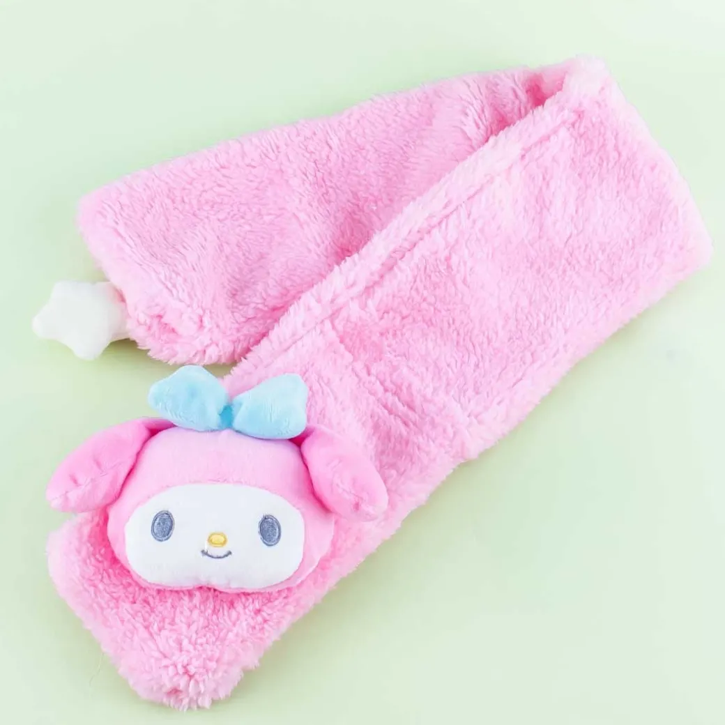- A cute pink fluffy scarf with a decor shaped like My Melody’s head attached to one of its ends