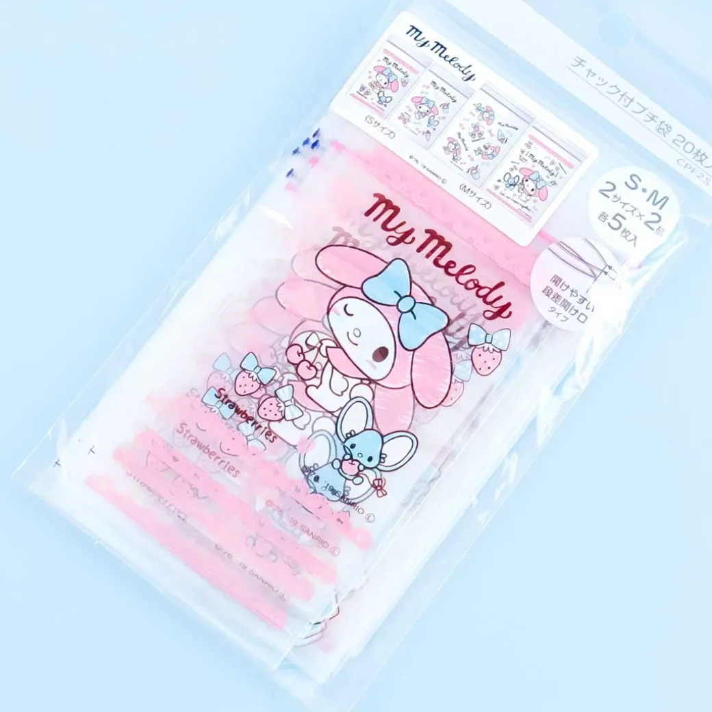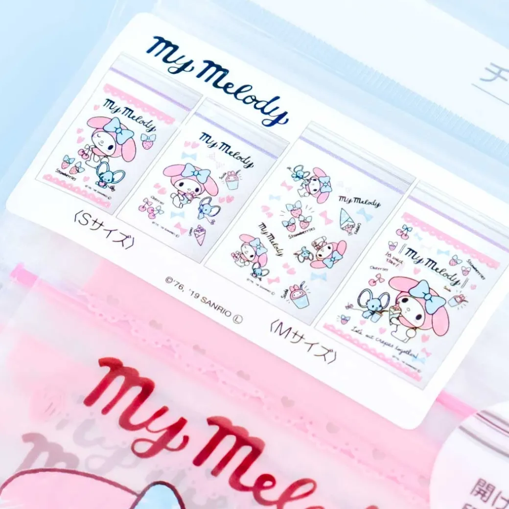 - A resealable storage bag featuring My Melody and fruits