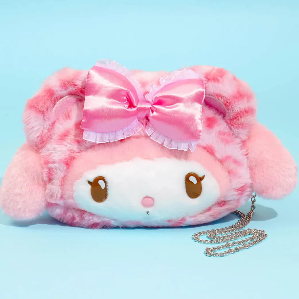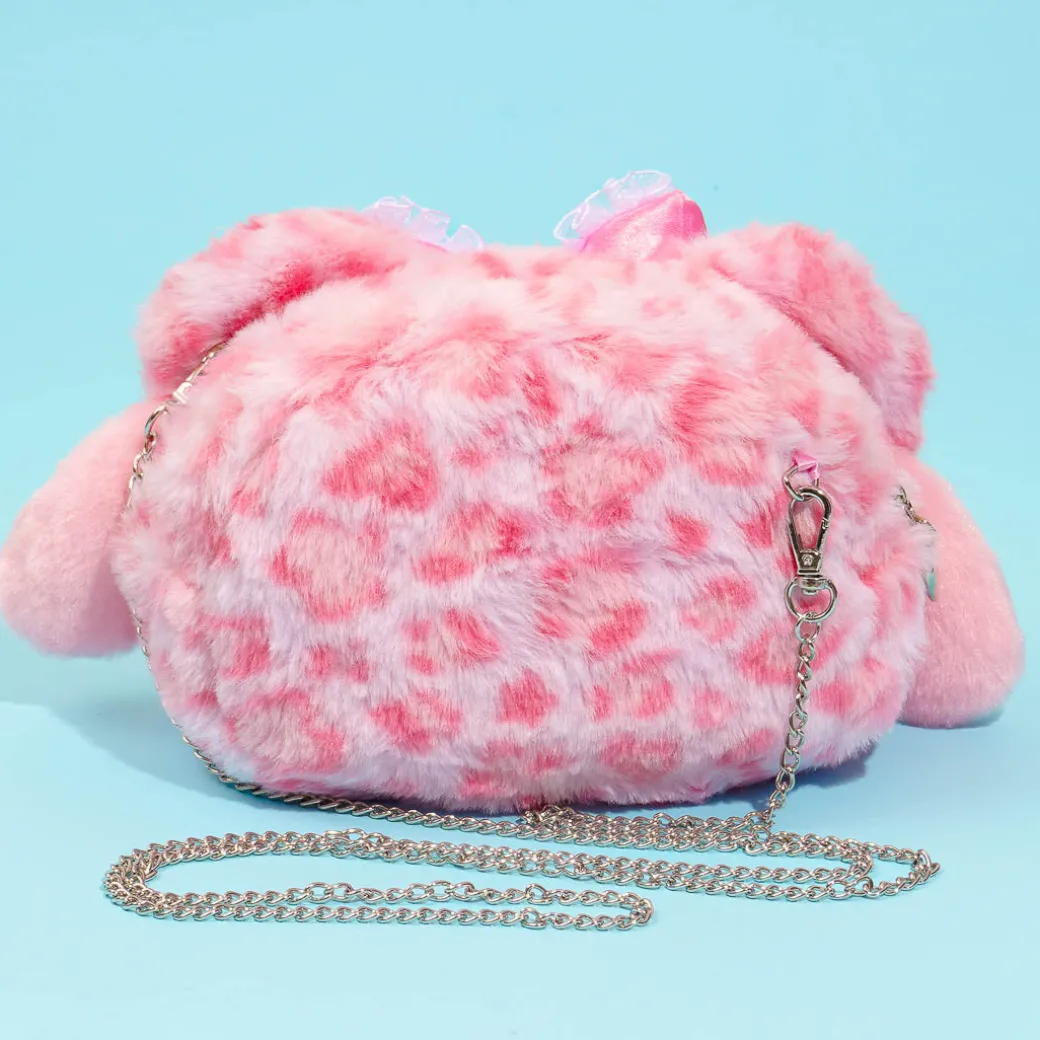 My Melody looks super cute with a big ribbon and leopard print bear onesie! Use this shoulder bag to bring your travel essentials kawaii-style. It has a heart-shaped zipper and a removable chain strap for added cuteness!