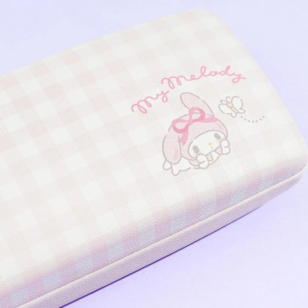 Keep your eyeglasses or sunglasses from getting lost by placing them inside this cute rectangle hard case! It’s decorated with pastel pink gingham patterns and a kawaii illustration of My Melody. It also comes with a cleaning cloth that has a matching print!