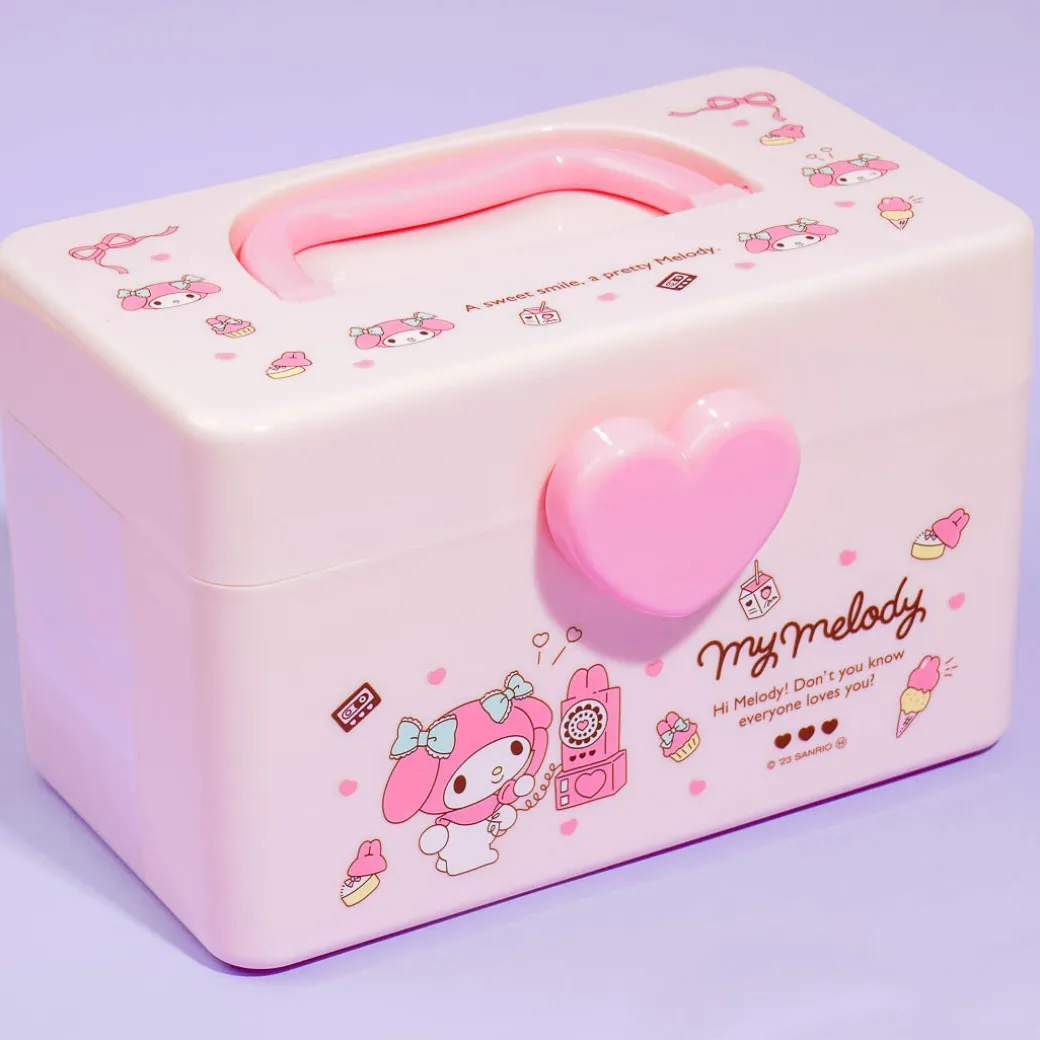 Use this cute storage box to organize your charms, hair clips, and other things. It’s illustrated with prints of My Melody surrounded by cute items! This handy box has a handle, a removable tray, and a heart-shaped lock.