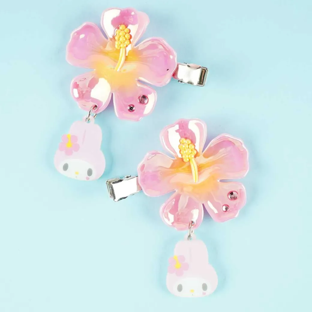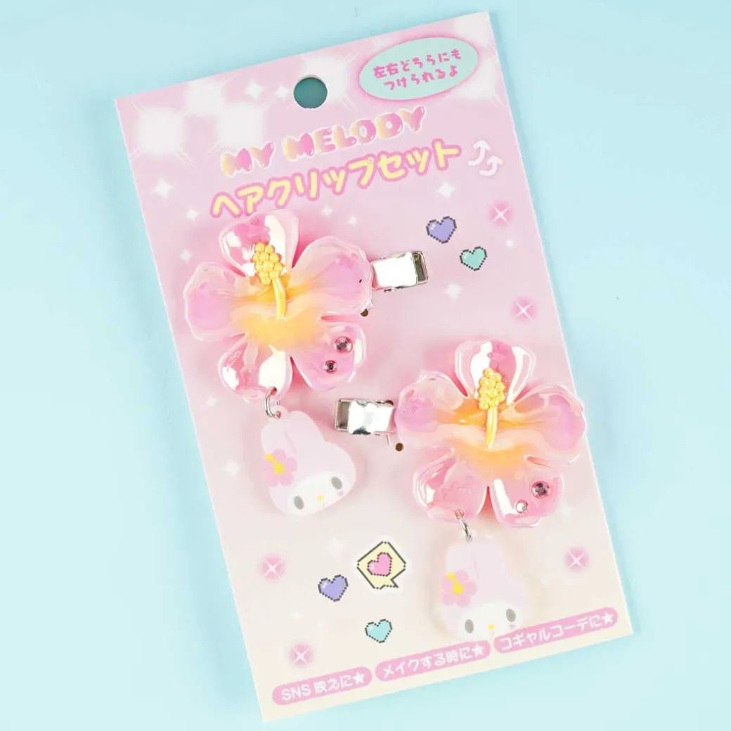 - A super cute set of hair clips with My Melody and hibiscus decors that fit in with gyaru fashion