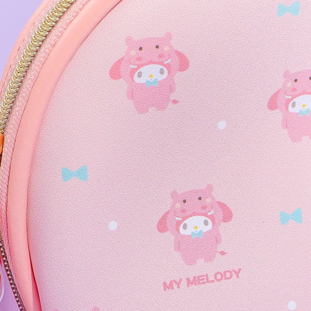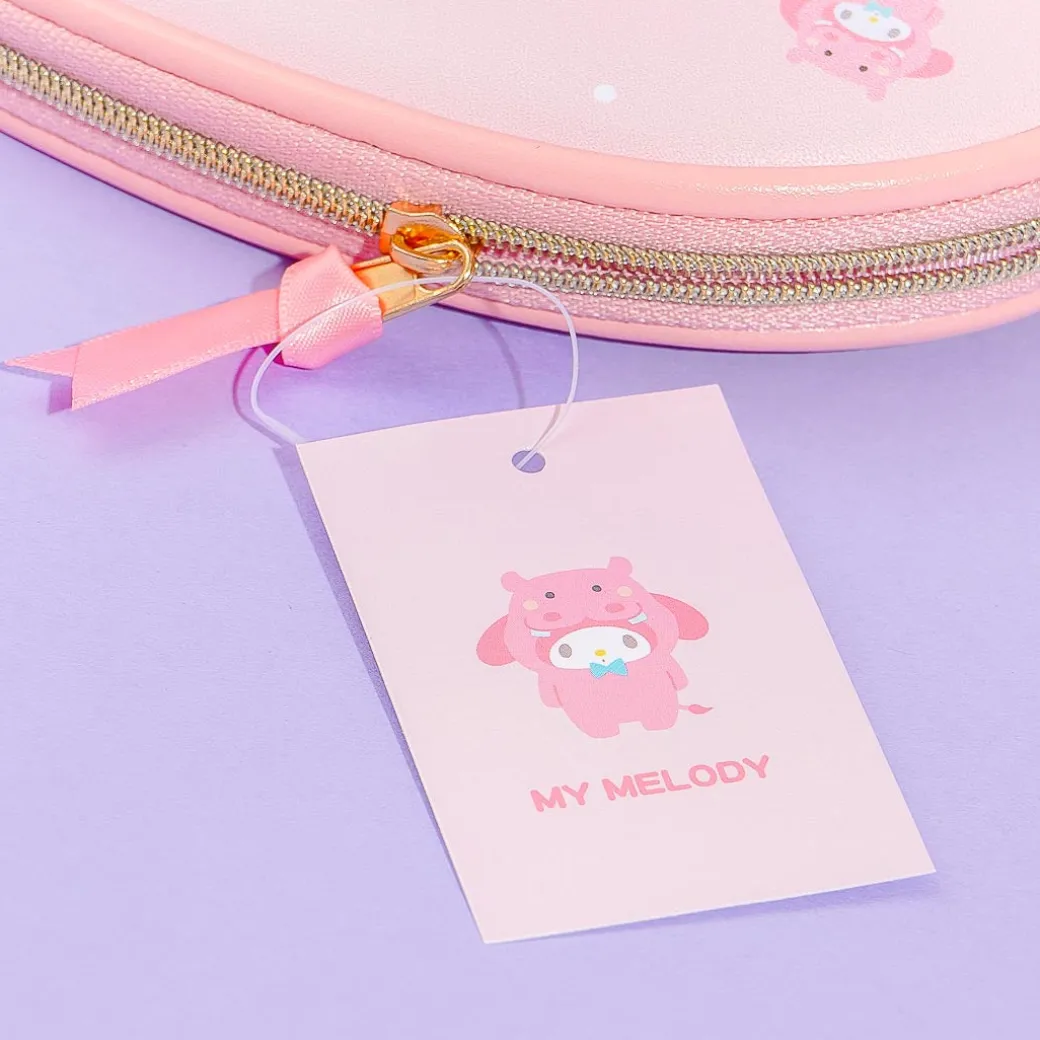 Organize your small essentials using this shell-shaped pouch! It features cute prints of My Melody wearing a hippo onesie. This pouch is made from synthetic leather and has a zipper closure.