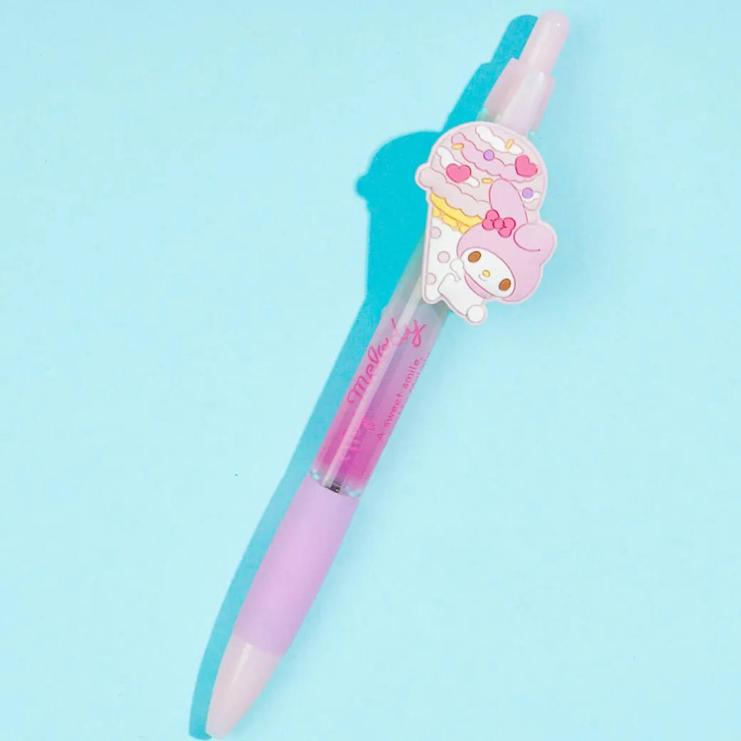 Have fun writing your notes using this kawaii click pen! Its cute charm features My Melody holding onto a giant ice cream cone. The pen has a gradient semi-transparent cover and a non-slip grip!