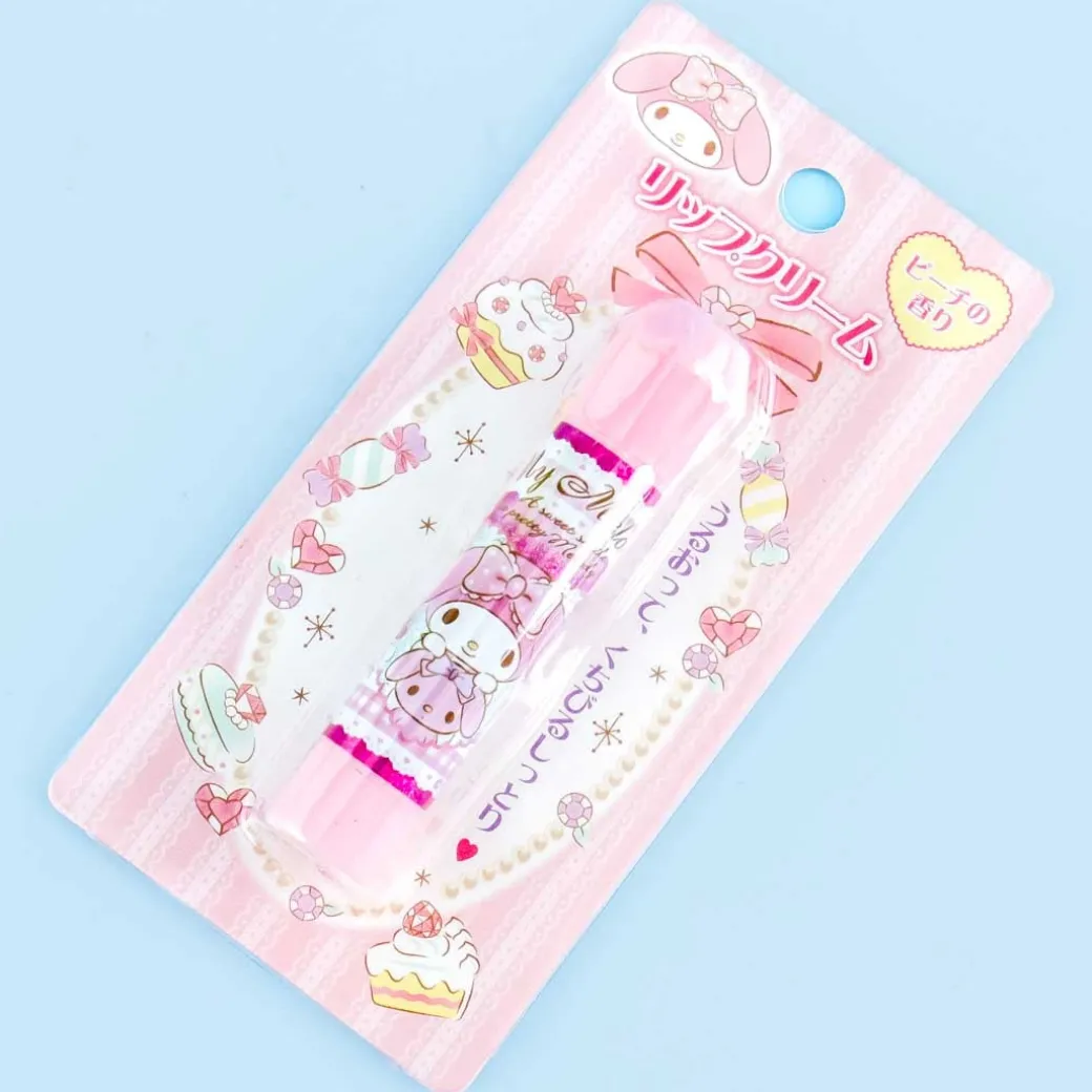- A moisturizing clear lip balm in a tube with illustrations of My Melody and sweet treats