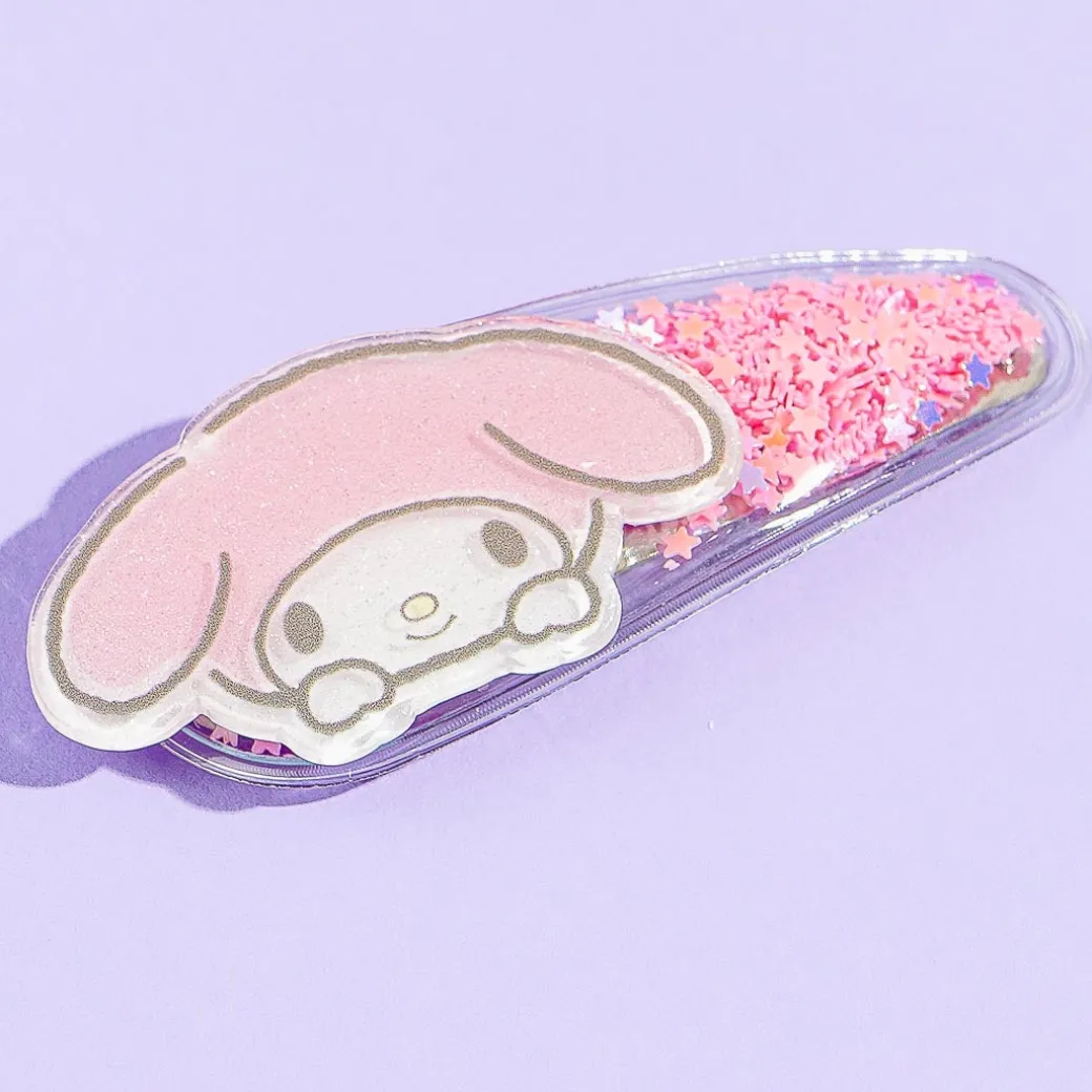 Watch the shiny pink stars move inside as you shake this cute transparent hair clip! It also comes decorated with a kawaii die-cut My Melody head charm.