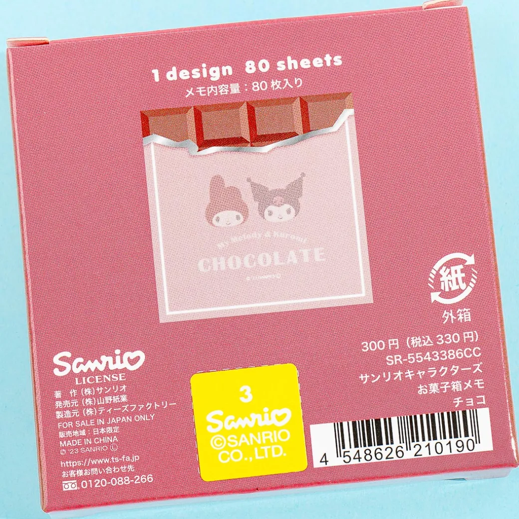 Write short and sweet notes to your besties using this cute square-shaped memo pad! It has super kawaii illustrations of My Melody, Kuromi, and chocolates! This memo pad set also comes with packaging that looks like a box of chocolates.