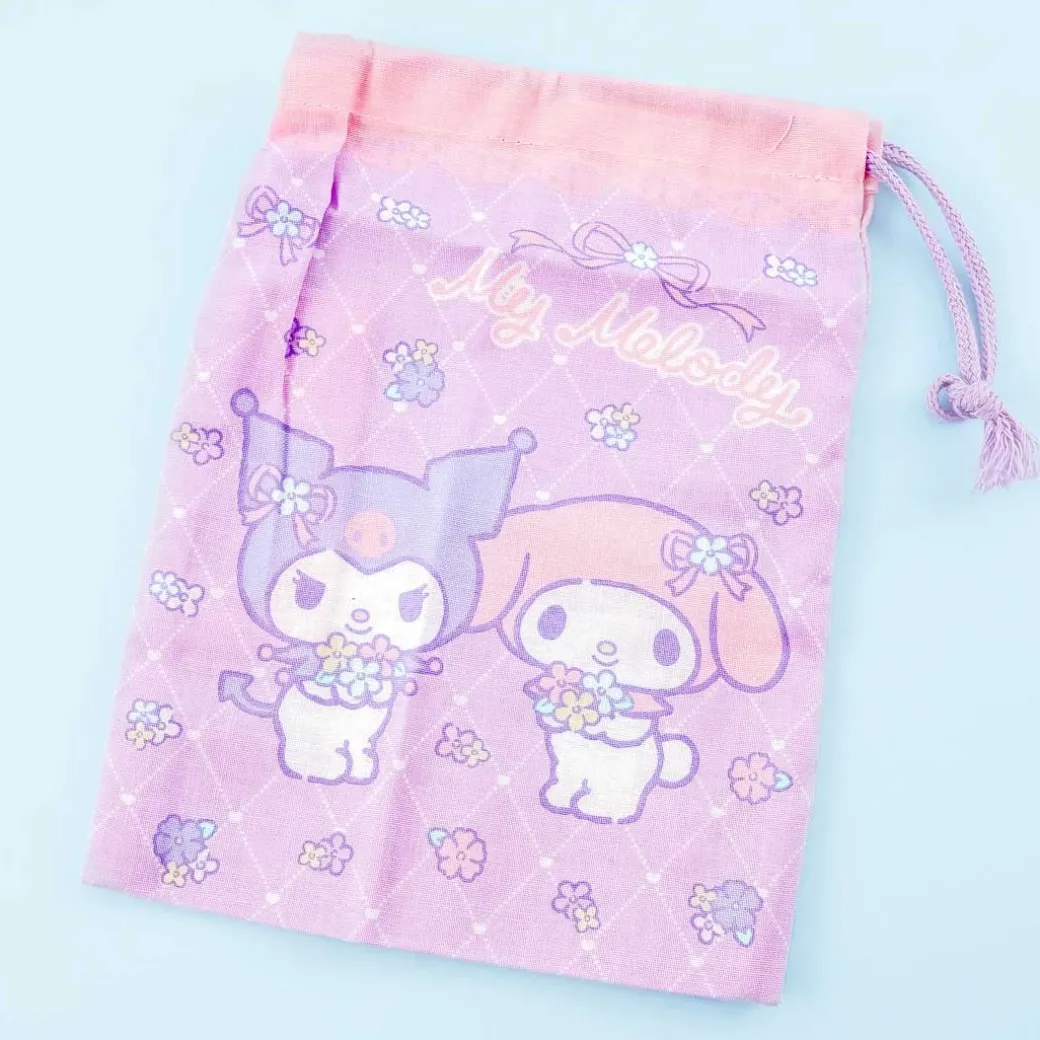 - A kawaii cotton drawstring pouch illustrated with My Melody and Kuromi picking flowers