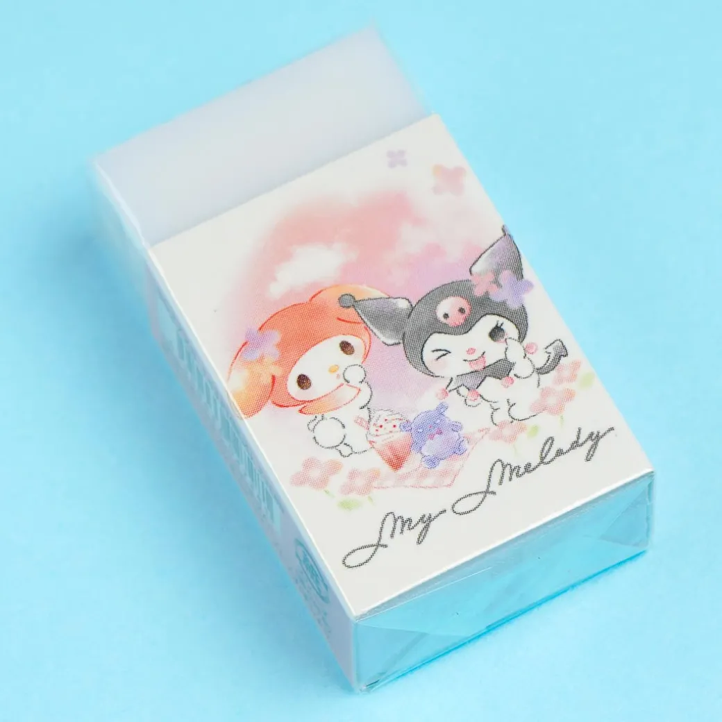 Use this kawaii eraser to keep your notes mistake-free! The cover features cute illustrations of My Melody and Kuromi taking photos in a garden.