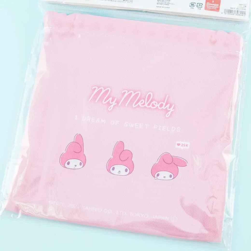 - A kawaii drawstring bag with prints of My Melody, her fave items, and basic info about her