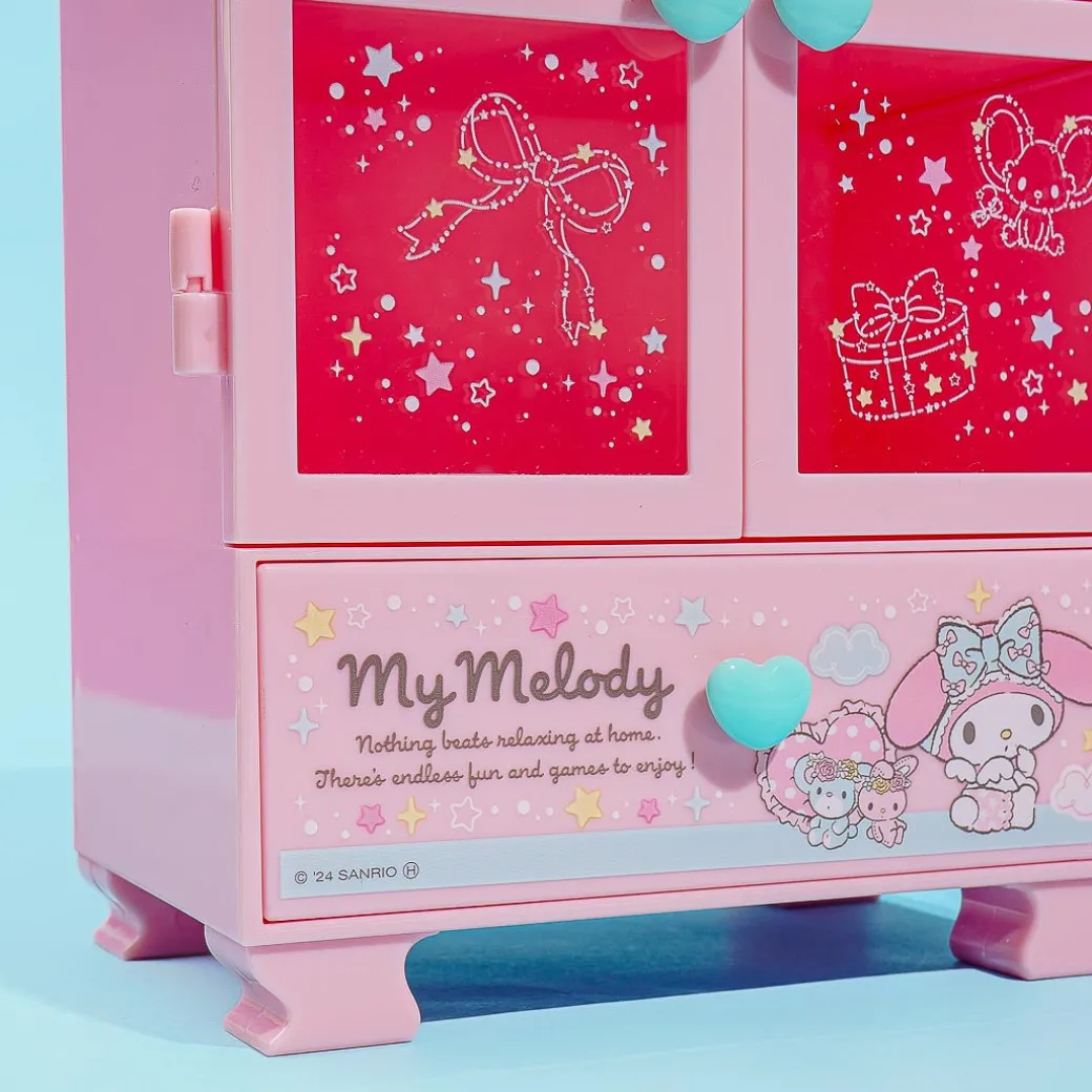 This pink case looks like a miniature version of My Melody’s bedroom closet! It has double doors, two shelves, and a bottom pull-out drawer. The clear windows also have cute prints of My Melody, stars, balloons, and other items. Store your favorite hair clips, hair ties, pins, and other hair accessories inside!