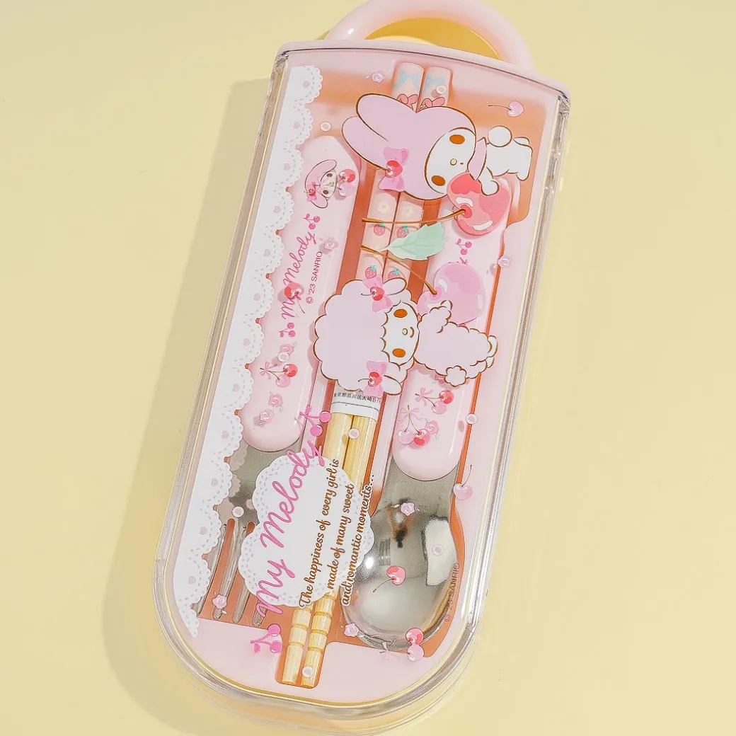 Add this kawaii utensil set to your lunch box! It showcases cute illustrations of My Melody and My Sweet Piano with cherries and strawberries. The set includes a pair of reusable chopsticks, antibacterial spoon and fork, and a carrying case with a sliding transparent cover. It also comes with a sticker for your name!