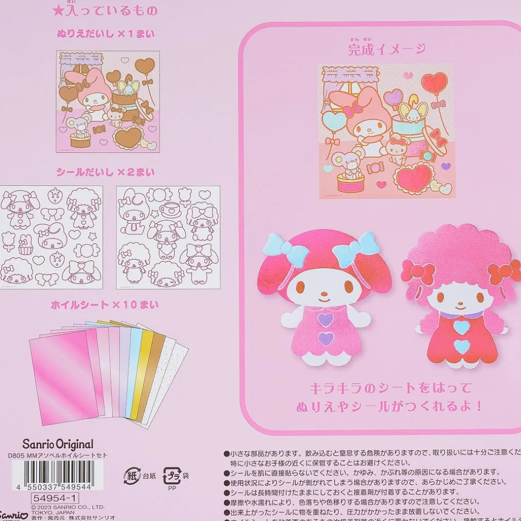 Have a fun afternoon playing with this super kawaii art set showcasing My Melody and My Sweet Piano. This set has a coloring sheet, stickers, and foil sheets for you to use. It’s perfect for crafting with friends!