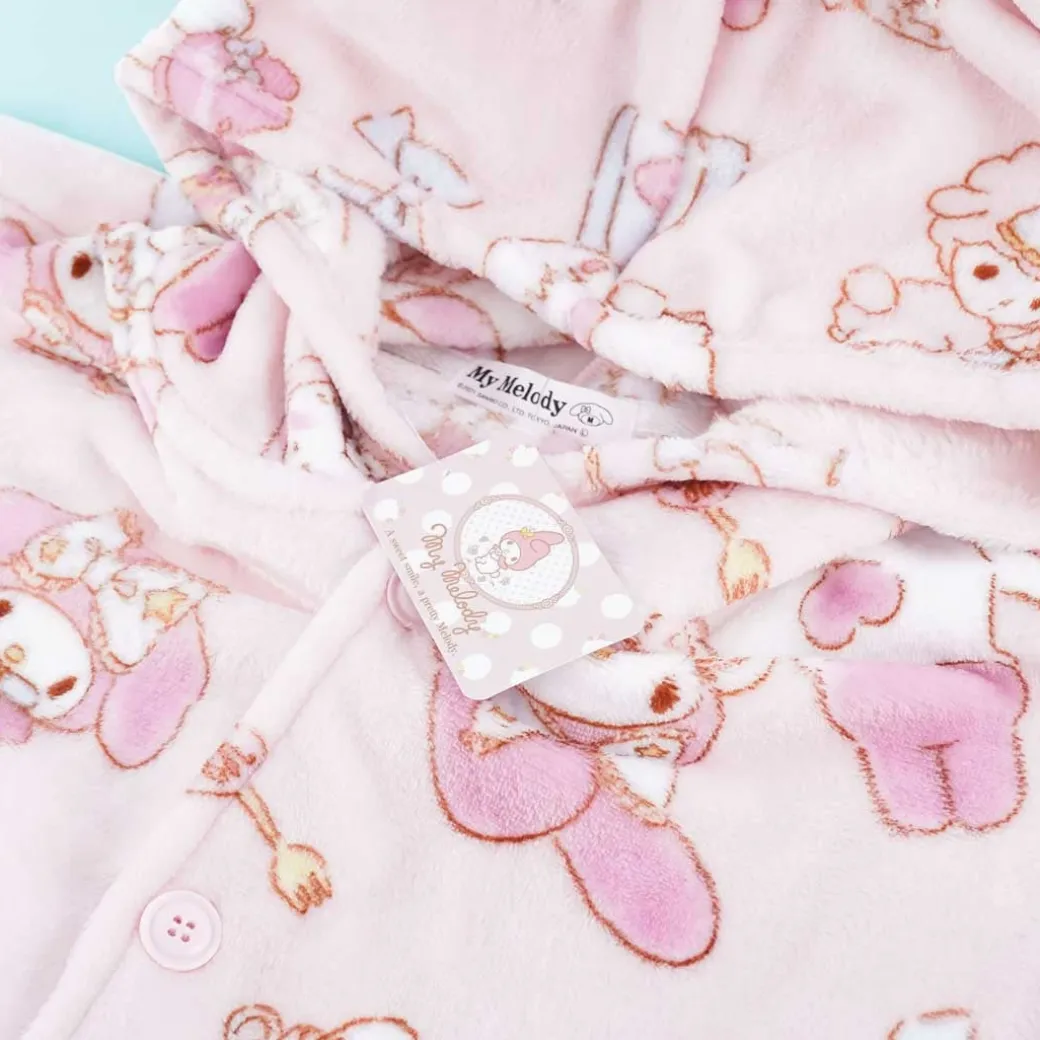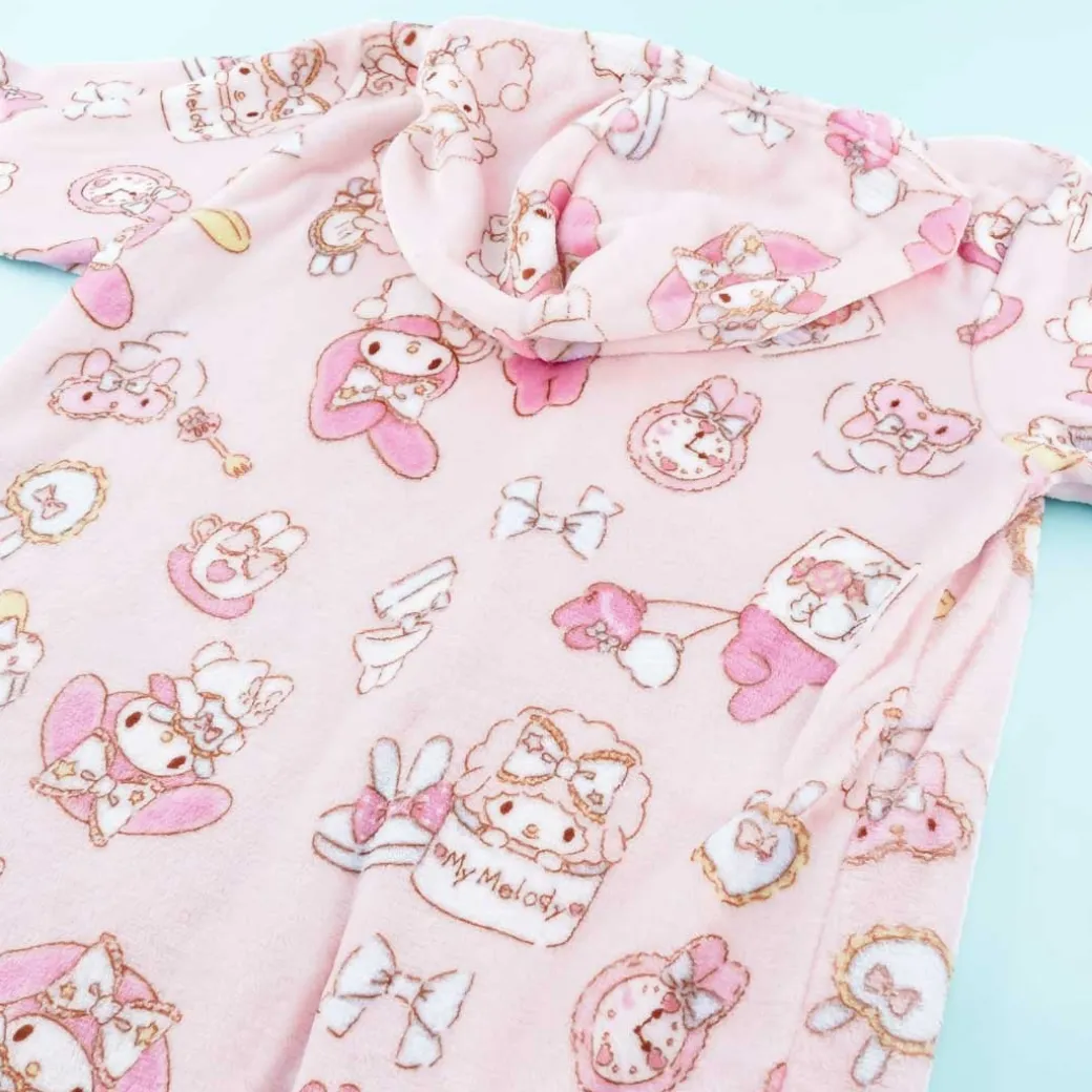 - A super cute hoodie robe featuring My Melody and My Sweet Piano having tea together