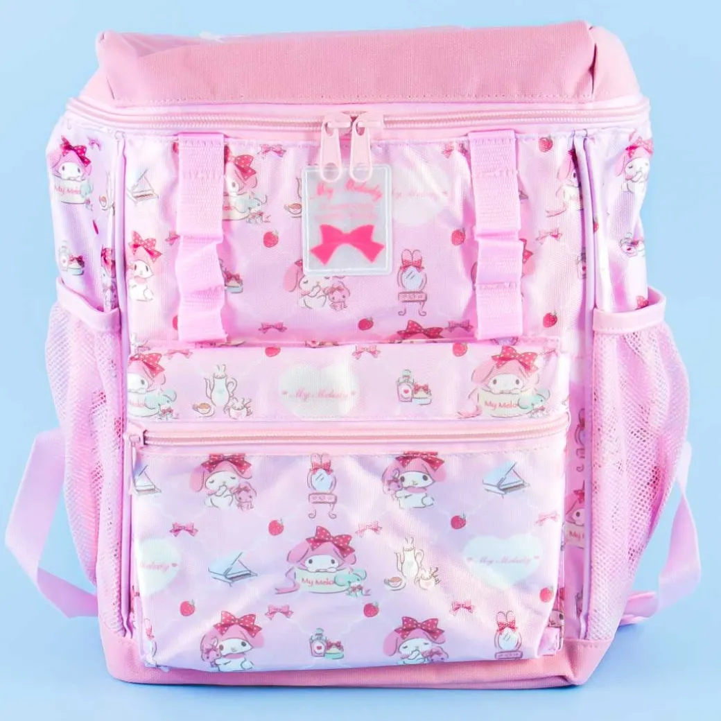 - A rectangular backpack featuring My Melody and her favorite objects