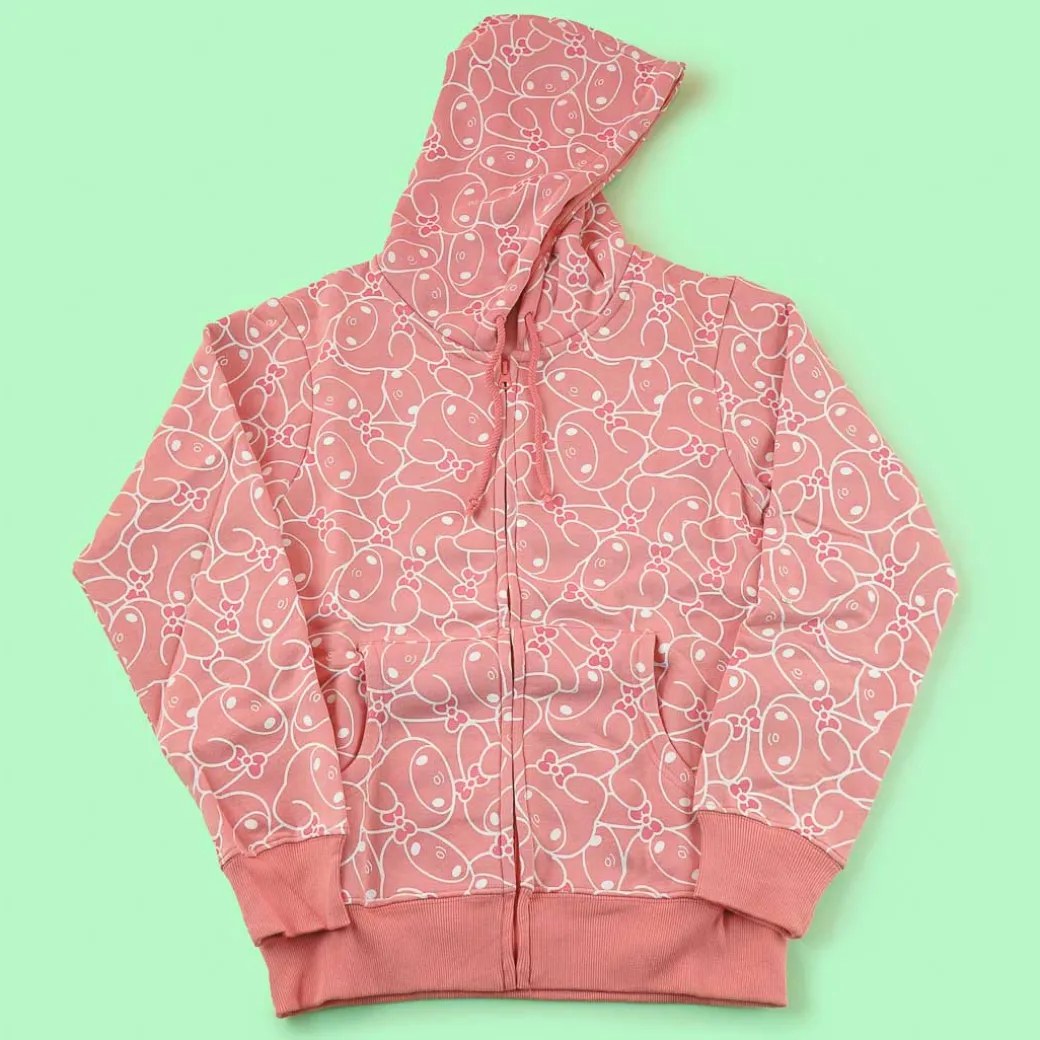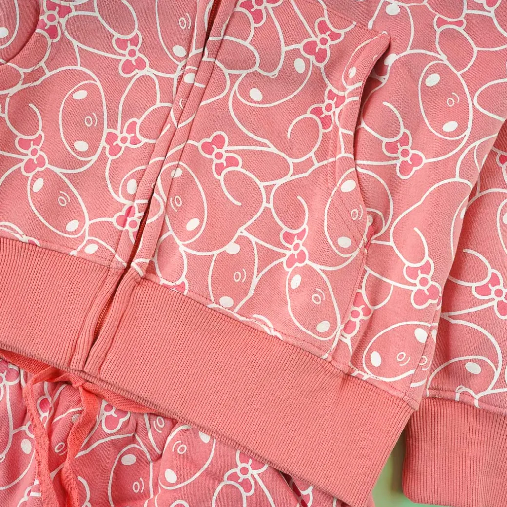 Lounge around the house wearing this comfy pink pajama set! It includes a long-sleeved hoodie with a matching pair of shorts. This kawaii set is decorated with prints of My Melody all over!